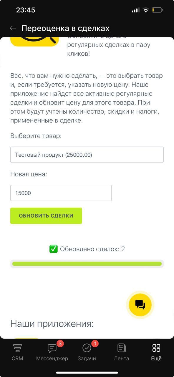 Все, что вам нужно сделать, — это выбрать товар и, если требуется, указать новую цену. Наше приложение найдет все активные регулярные сделки и обновит цену для этого товара. При этом будут учтены количество, скидки и налоги, примененные в сделке.