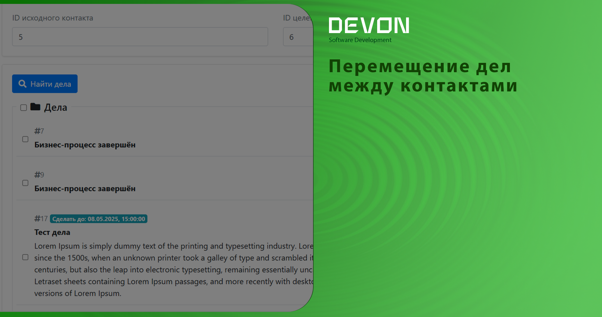 Для этого просто укажите ID контакта, из которого необходимо скопировать дела, и ID контакта, в который их необходимо добавить.