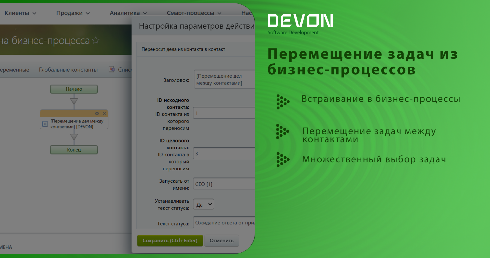 Легко перемещайте дела из одного контакта в другой вручную или из бизнес-процесса
