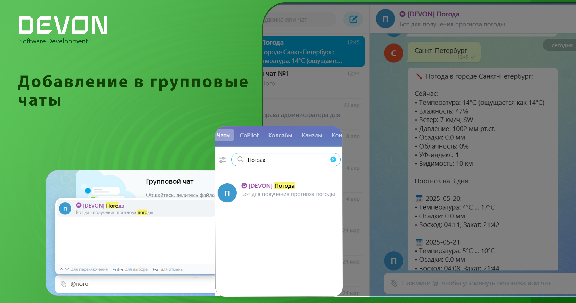 Если вы используете бот в групповом чате, его необходимо добавить в чат, после чего обращаться к нему через "@погода название города".
