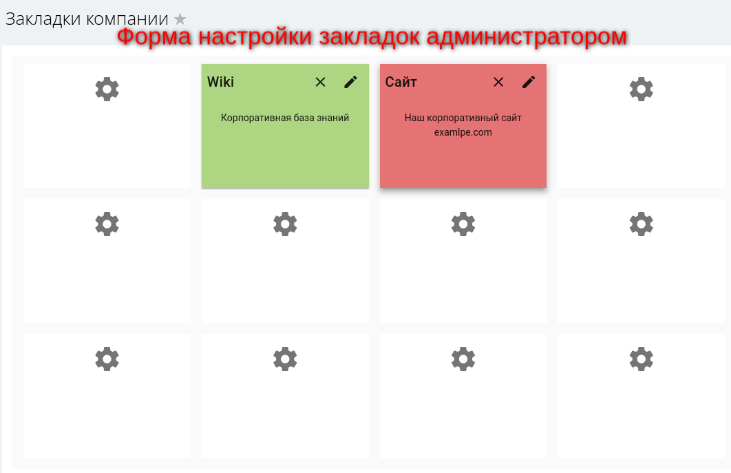 Приложение представляет собой страницу с блоком из 12 виджетов (4 на 3). Для каждого виджета администратор может настроить название, описание, ссылку и цвет.
