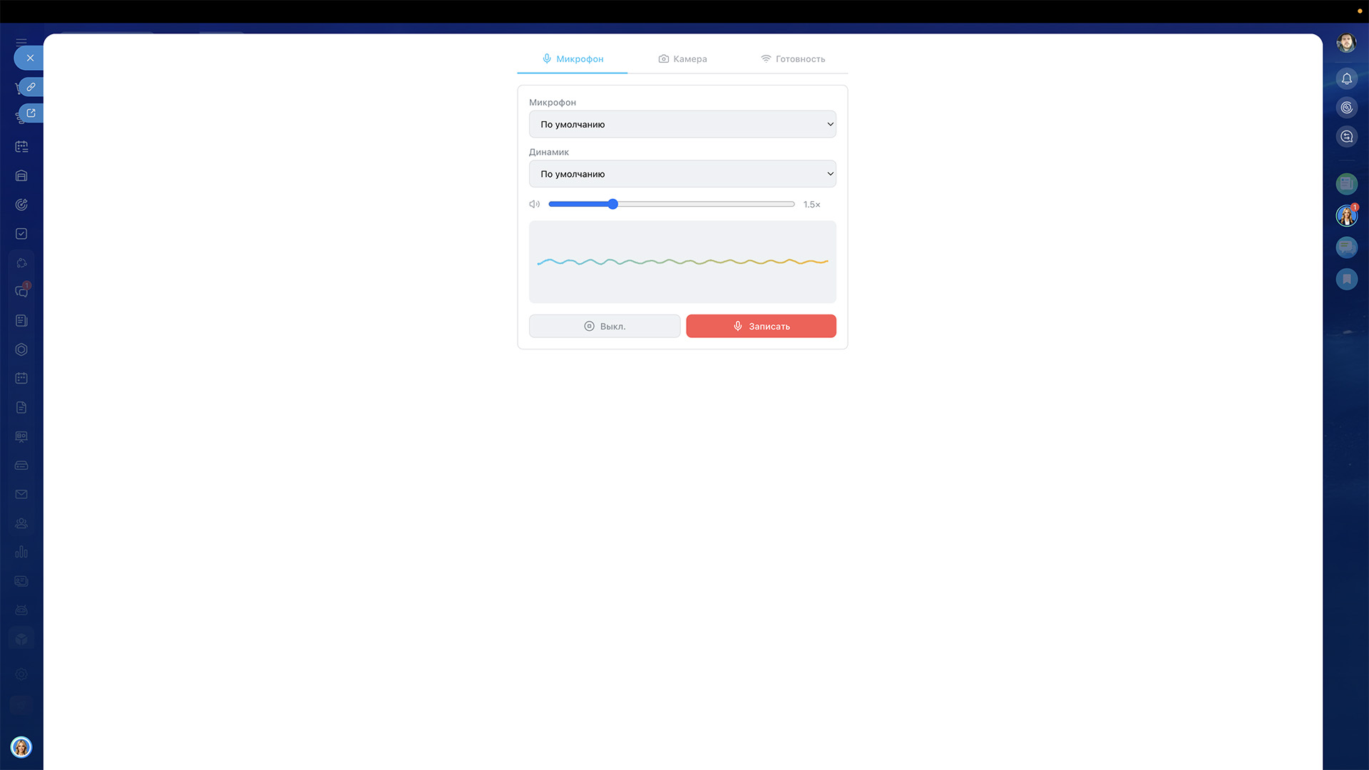 • Тестирует микрофон — визуализация звука, запись и воспроизведение голоса