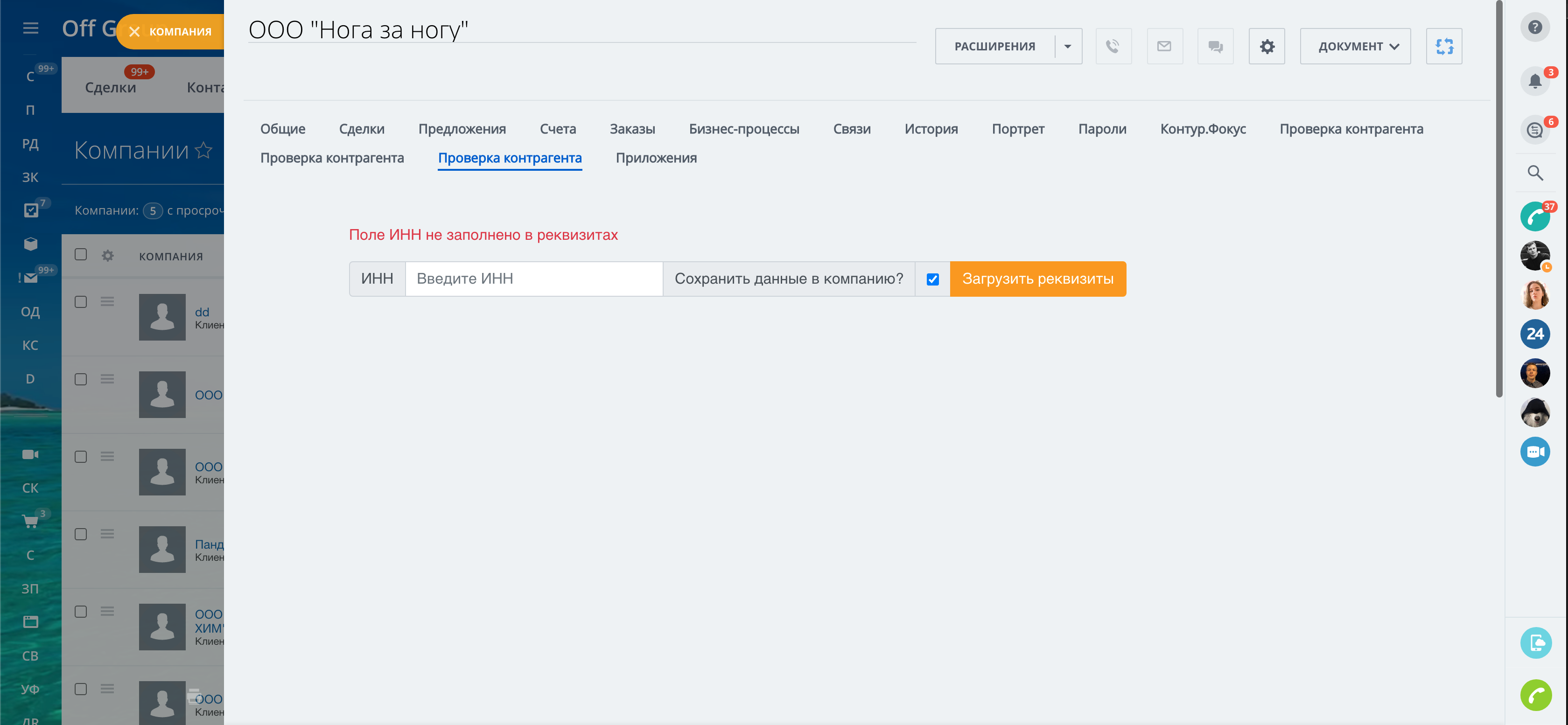 Если ИНН не заполнен, то на вкладке "Проверка контрагента" вам будет предложено ввести ИНН. При нажатии на кнопку "Загрузить реквизиты" подгрузится отчет из DaData. Если установлена галочка "Сохранить данные в компанию", реквизиты будут сохранены в этой компании в Битрикс24.