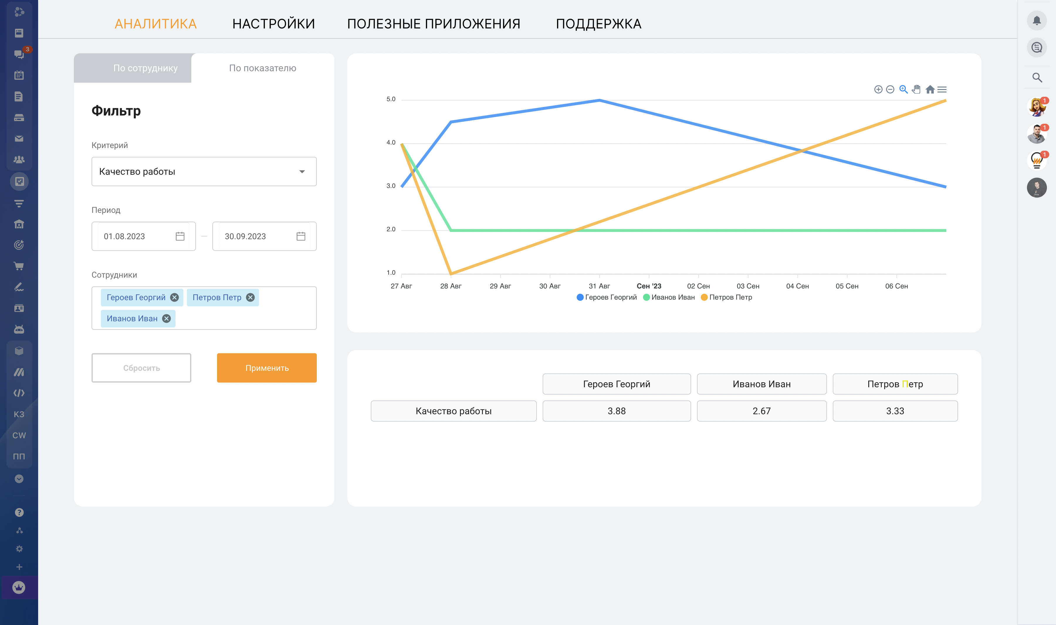 - В разрезе критерия - динамику по каждому сотруднику в периоде