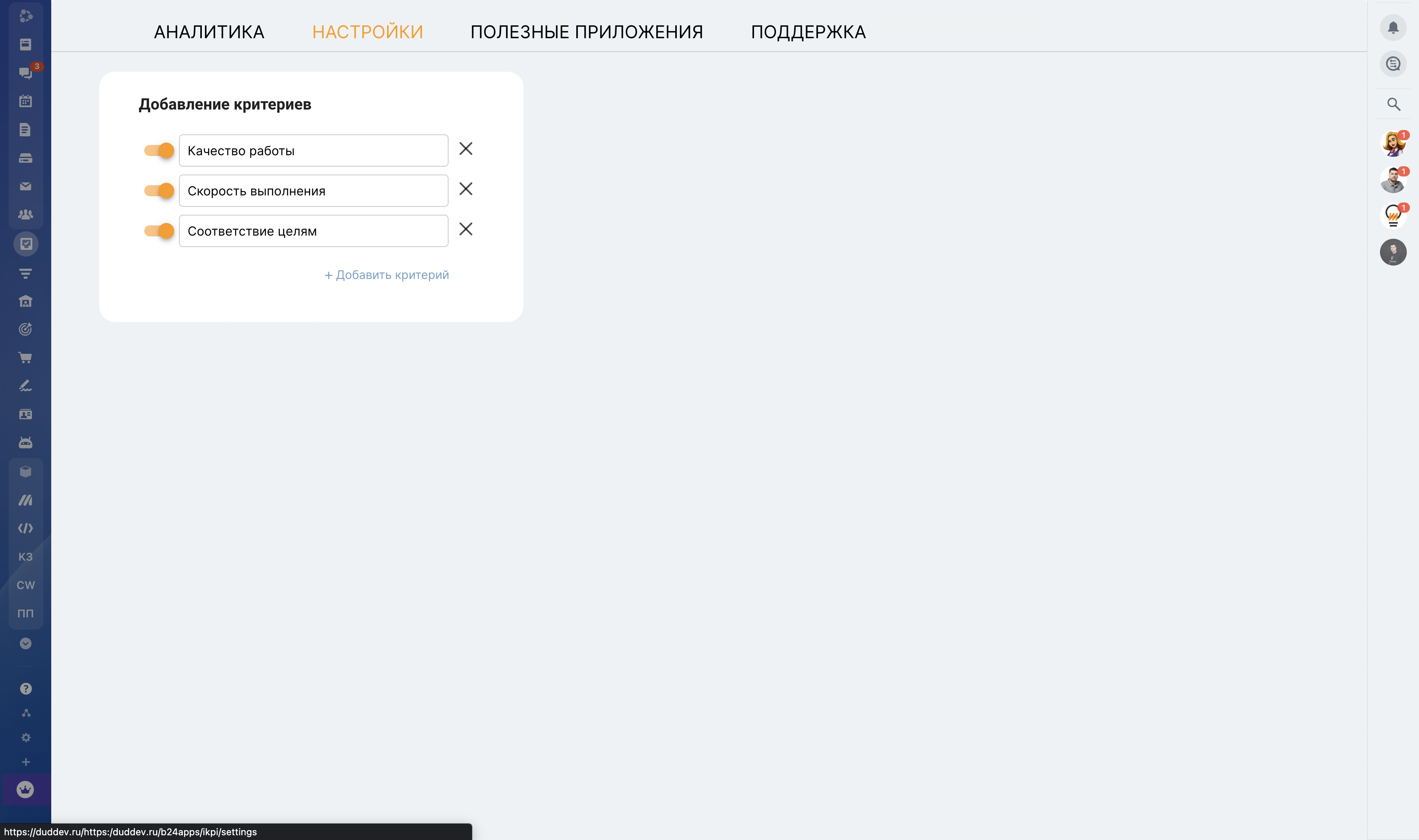 В настройках приложения вы добавляете критерии, которые хотите отслеживать при выполнении сотрудниками задач.