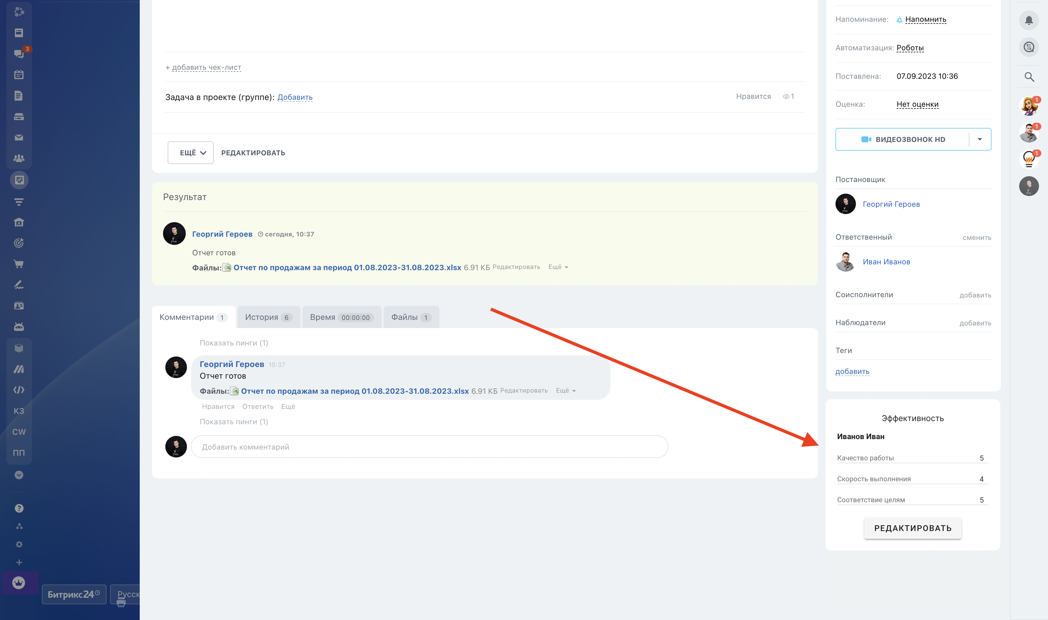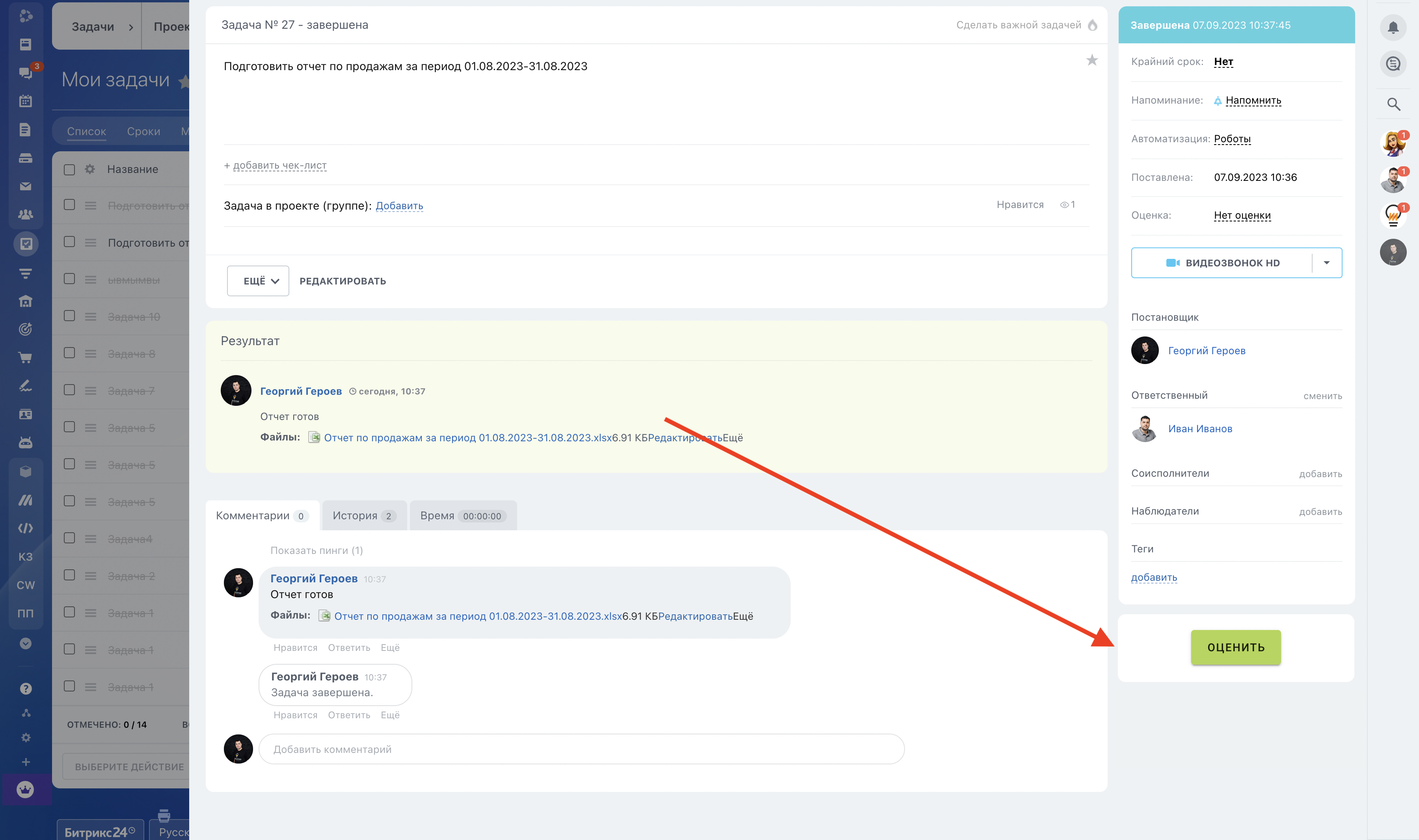 Постановщик оценивает каждую завершенную задачу по заданным критериям для каждого исполнителя (Ответственный + Соисполнители). Интерфейс добавления оценки встраивается в карточку задачи в правый блок с настройками.
