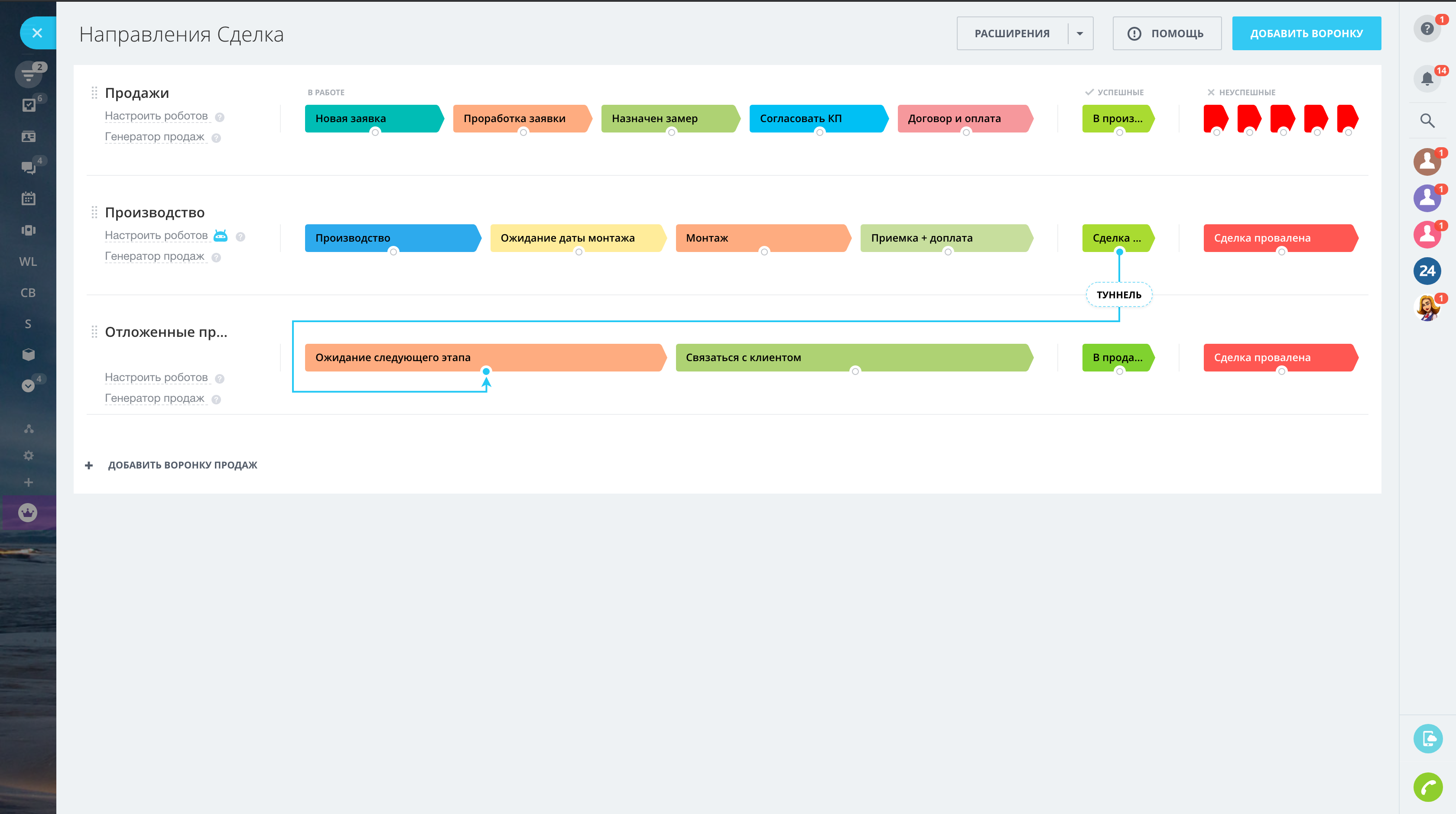 В системе предусмотрено 3 воронки для работы с клиентом.