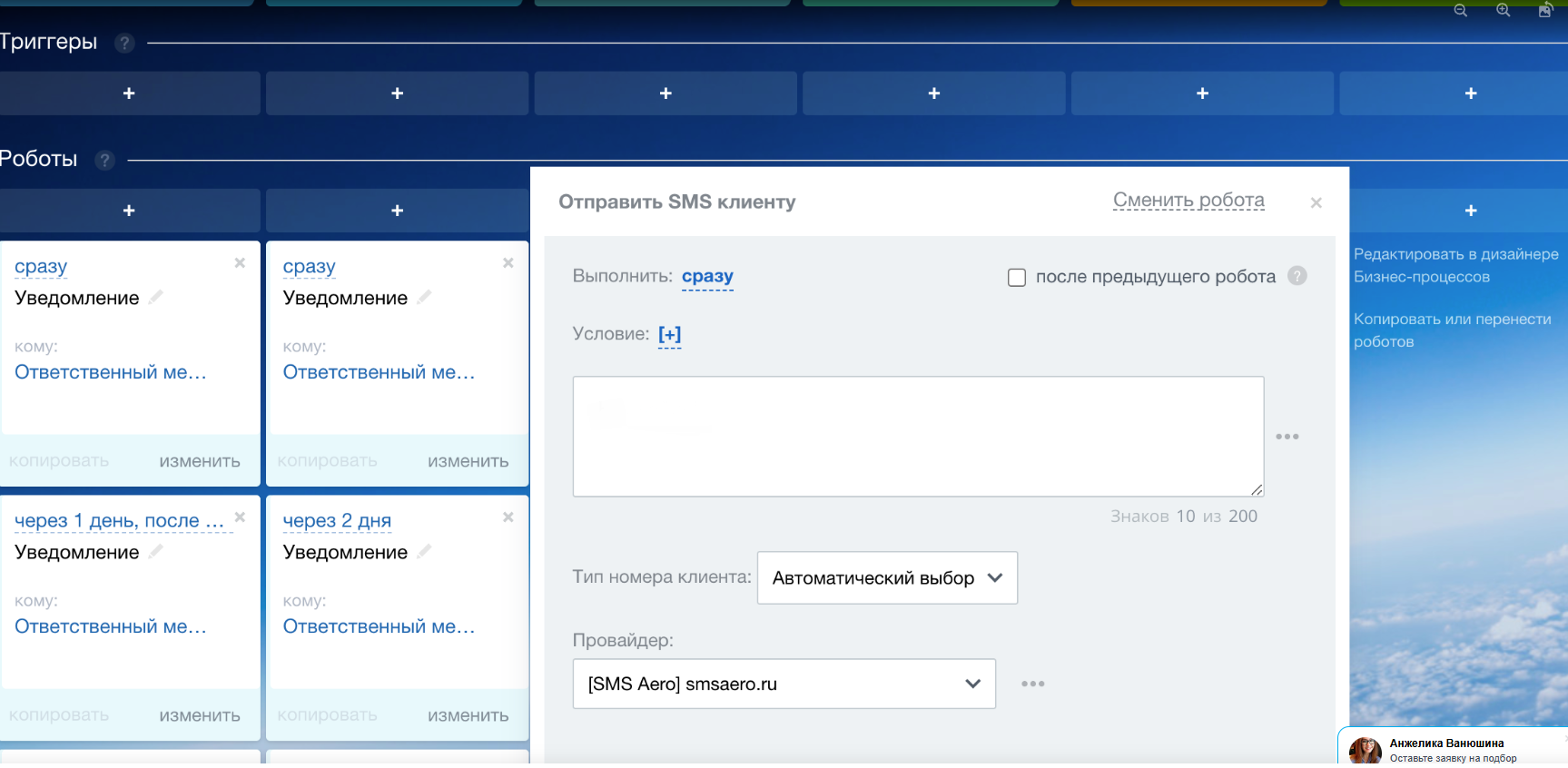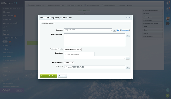 Приложение позволяет отправлять СМС-сообщения из Битрикс24 с использованием сервиса SMS Aero