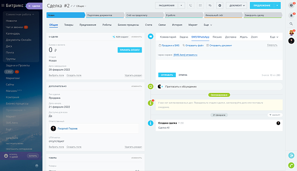 - Отправлять СМС из карточек лидов, сделок, контактов, компаний, смарт-процессов