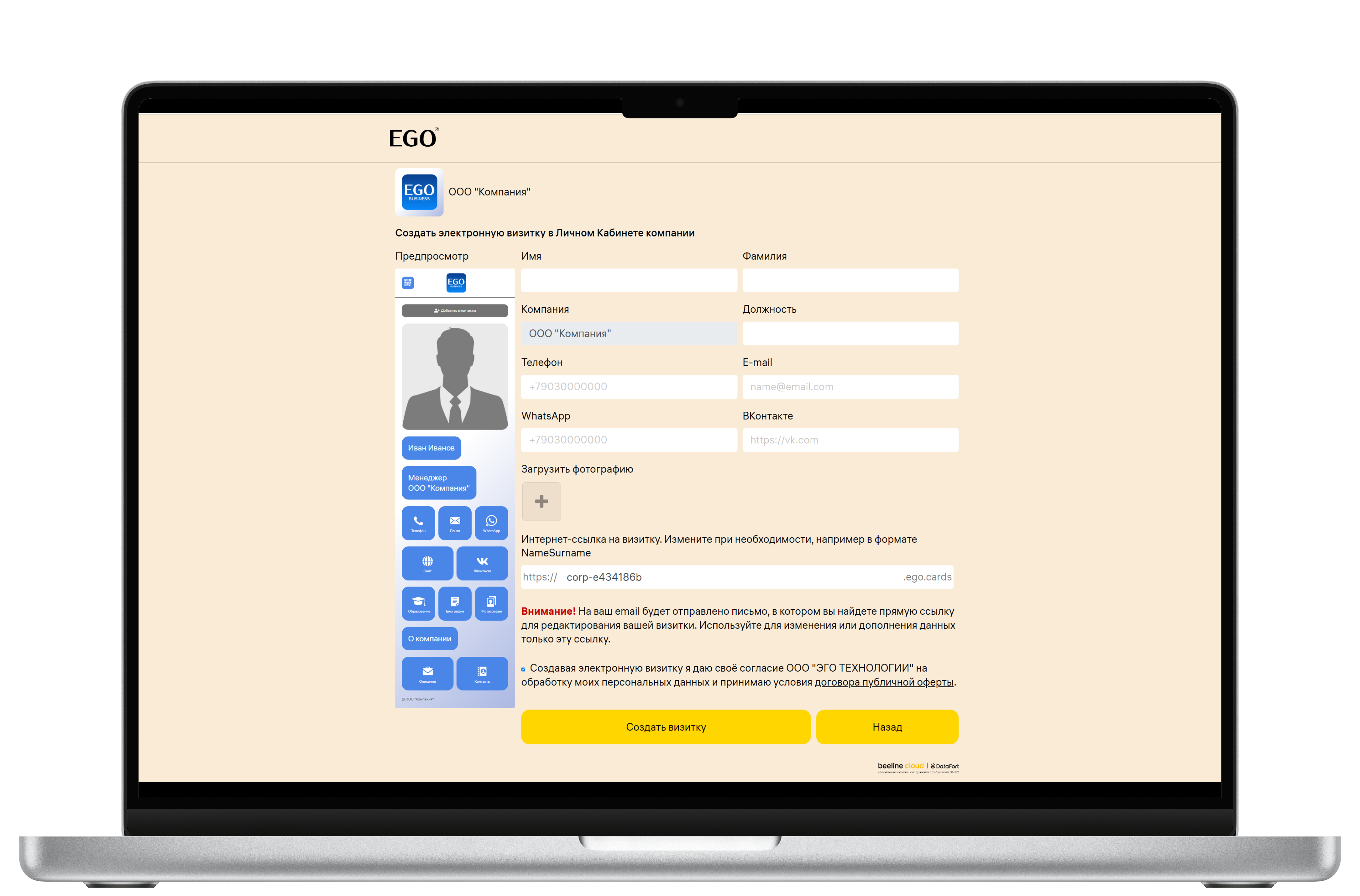 3. Форма для создания электронных визиток EGO для сотрудников компании.