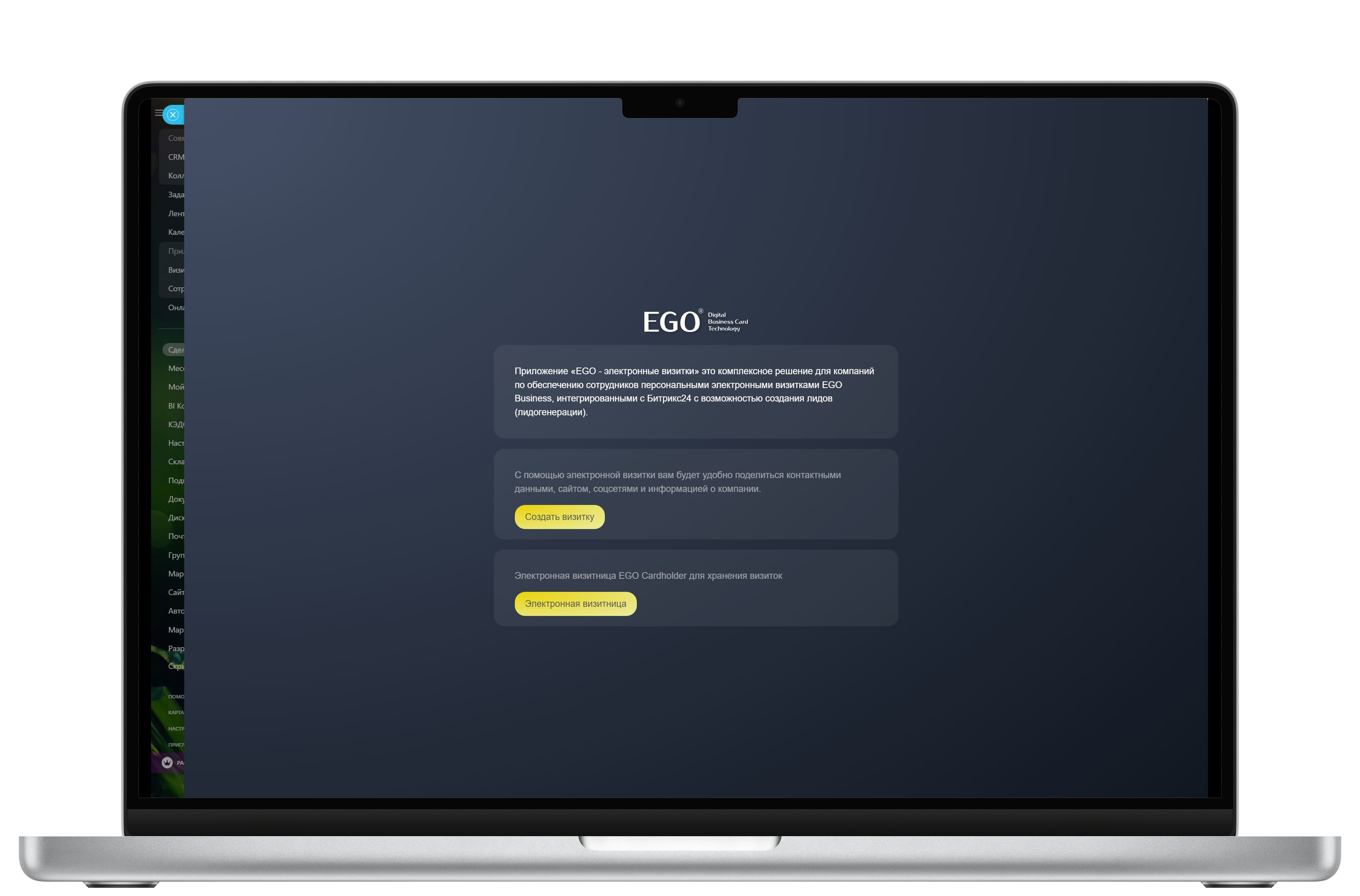 Приложение «EGO - электронные визитки» это комплексное решение для компаний по обеспечению сотрудников персональными электронными визитками, интегрированными с Битрикс24 с целью создания лидов (лидогенерации).