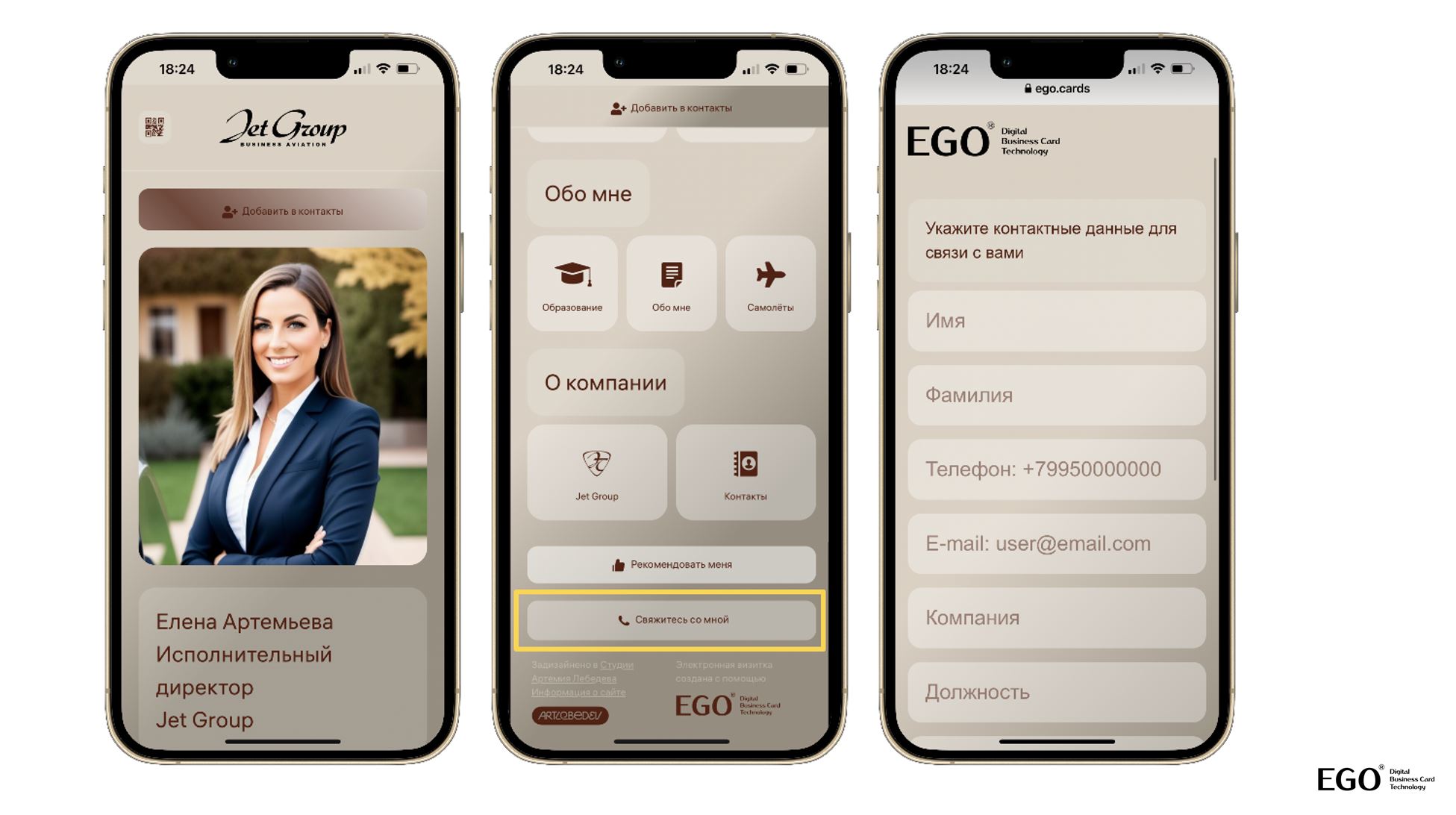 С помощью визитки EGO вам будет удобно делиться контактными данными, сайтом, соцсетями, и информацией о компании.