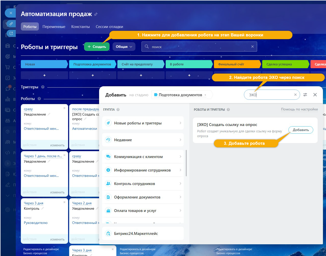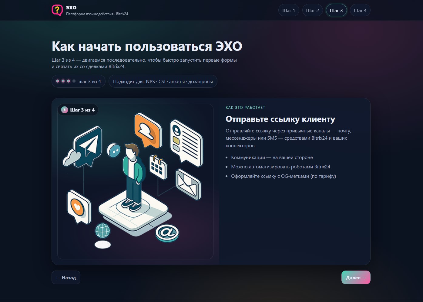 С помощью входящего в приложение робота, ЭХО на определенном этапе создает для сделки уникальную секретную ссылку на взаимодействие — а вы сами выбираете, каким образом и когда отправить её клиенту: через e-mail, SMS или мессенджеры, используя встроенные коннекторы Битрикс24 и соответствующих роботов. Так вы сохраняете личный подход и контроль над общением.