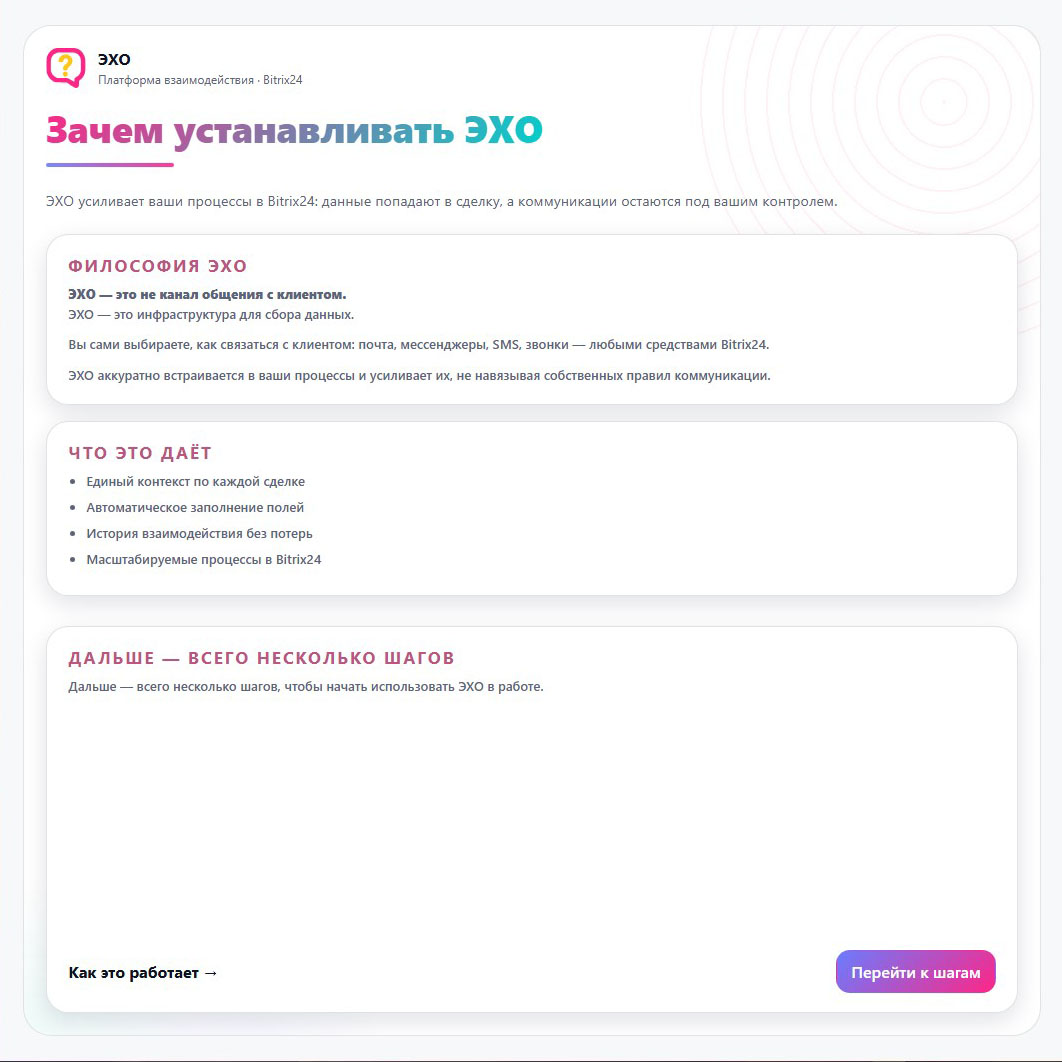 ЭХО не заменяет коммуникацию с клиентом, а деликатно расширяет возможности CRM.