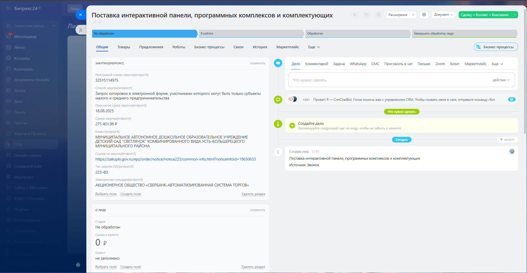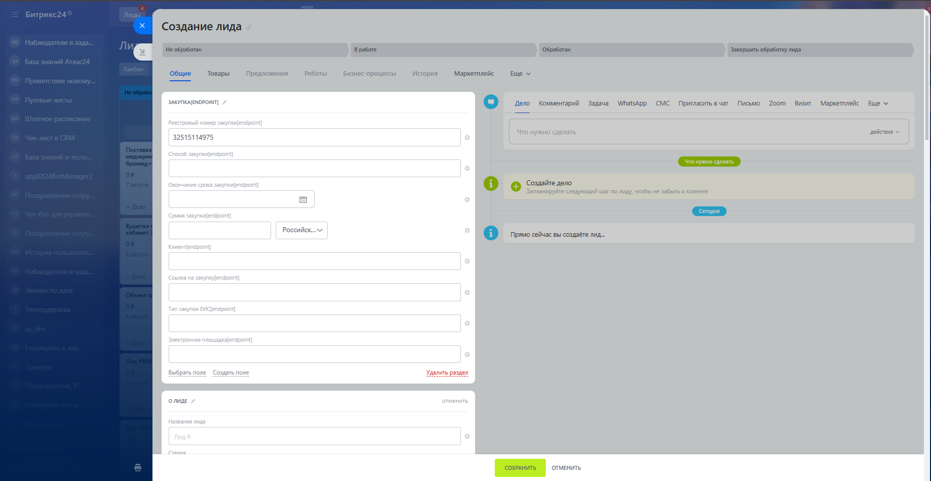 - Автозаполнение при создании: при создание лида, введите реестровый номер закупки и нажмите кнопку сохранить.