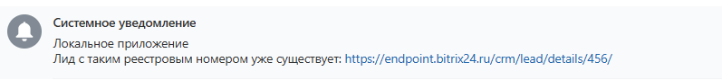 - В случае, если лид с вводимым реестровым номером уже существует, приложение удалит создаваемый лид и отправит уведомление с ссылкой на существующий лид.