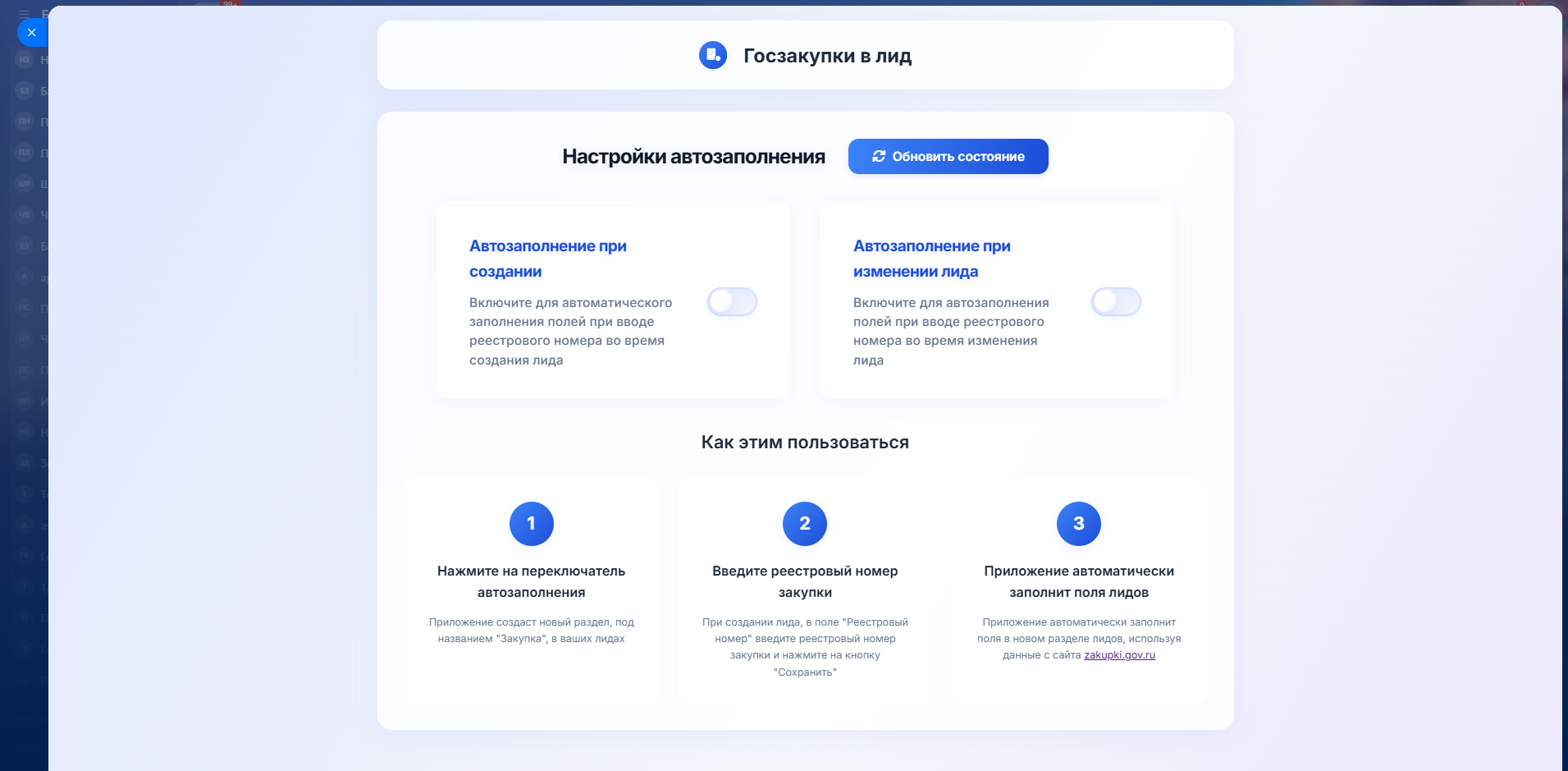 После установки приложения у вас появится возможность включить два способа заполнения лидов, по реестровому номеру госзакупки: