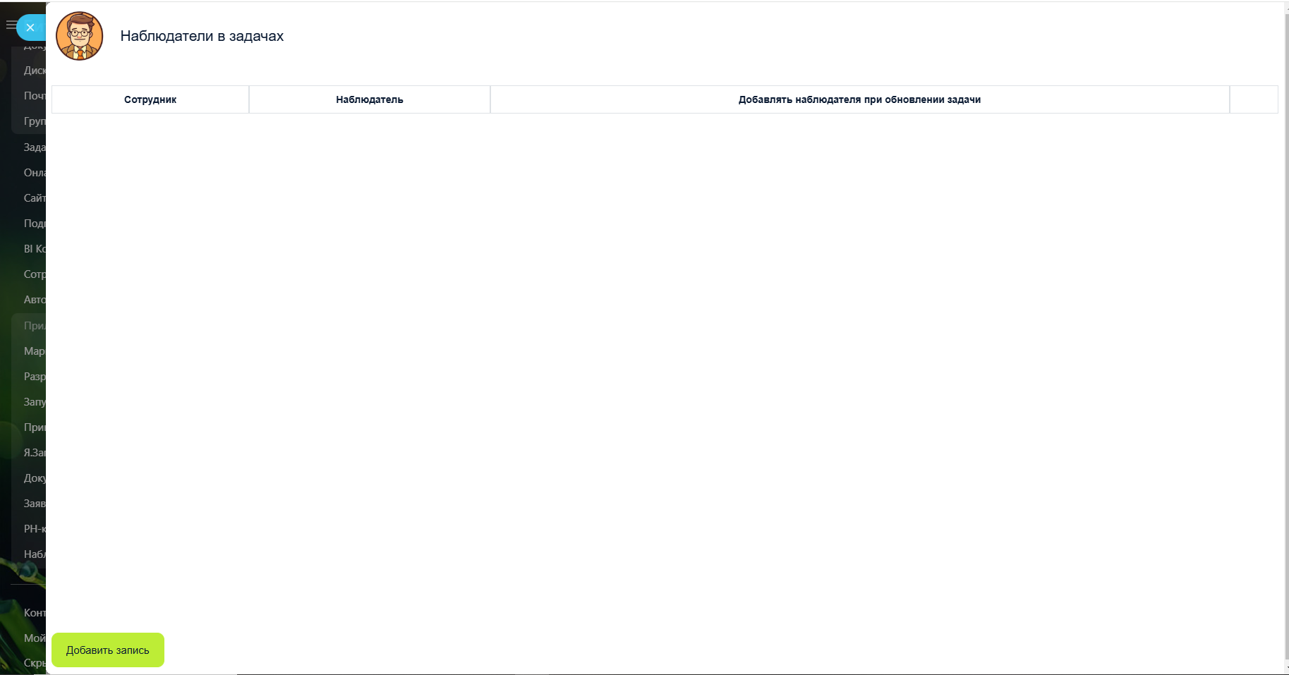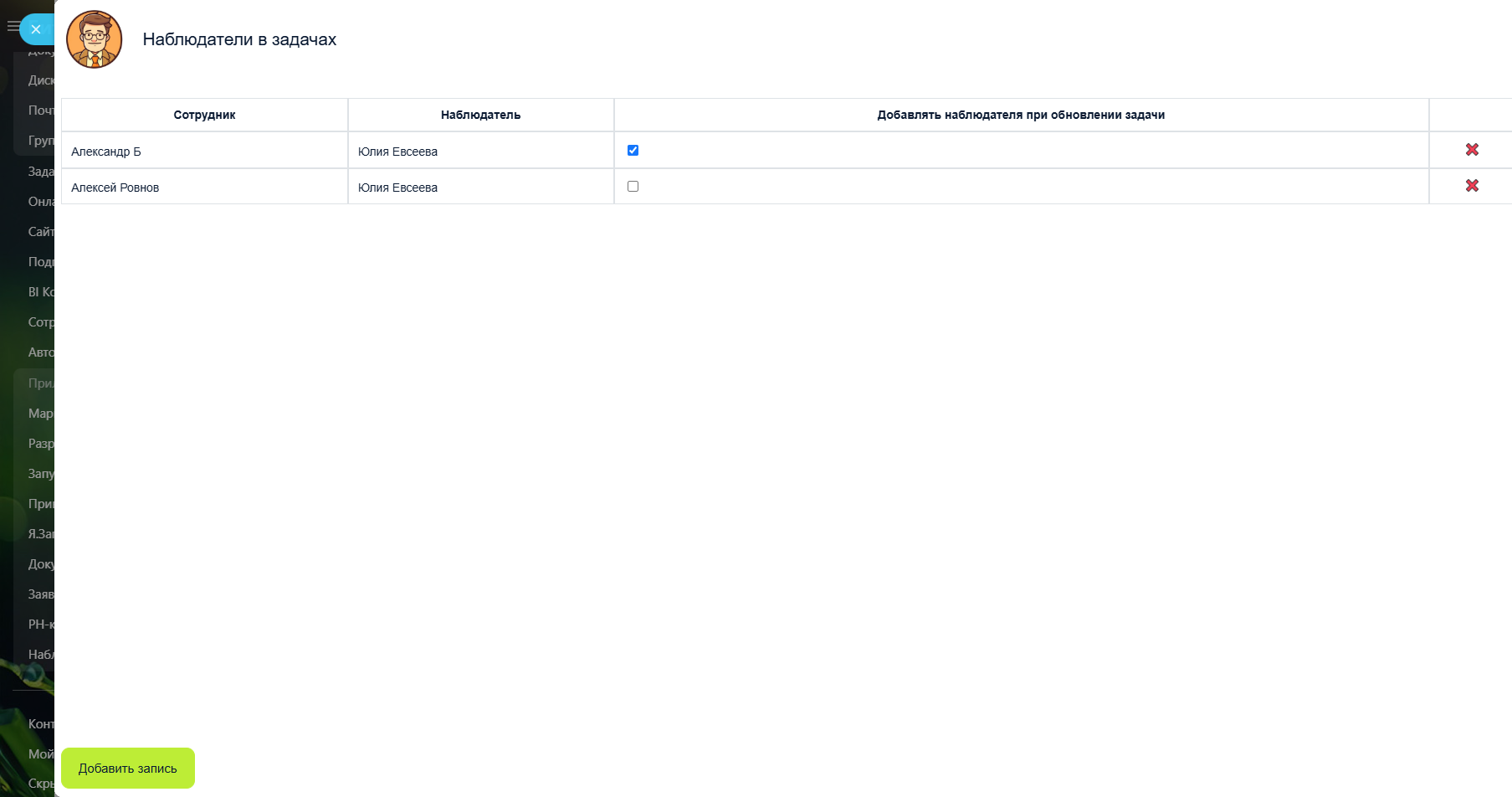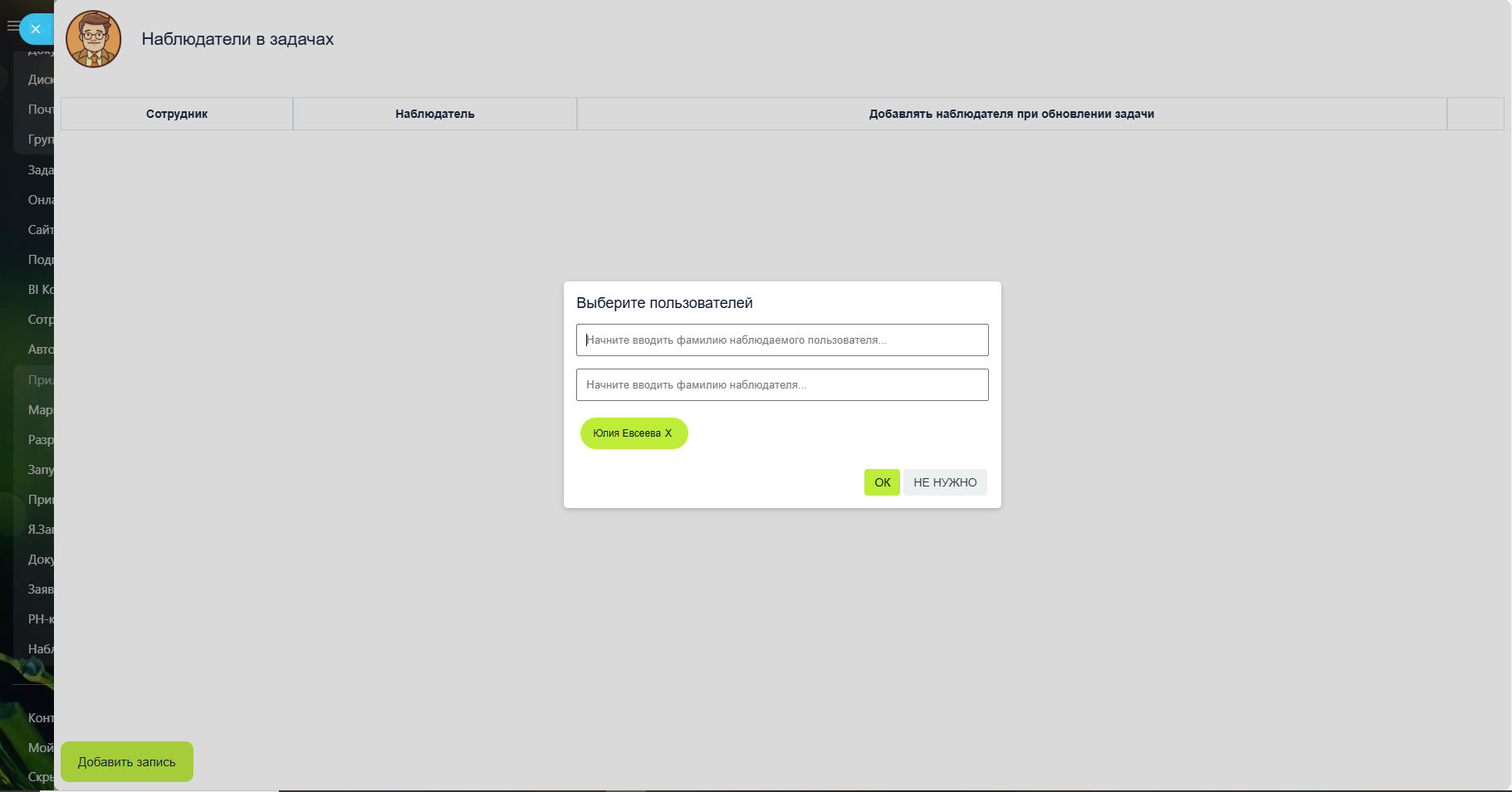 Для создания нового правила необходимо нажать кнопку "Добавить запись". Отобразится окно, в котором нужно будет выбрать наблюдаемого сотрудника (ответственного за задачу) и наблюдателя. Можно выбрать несколько сотрудников, тогда создастся несколько правил.