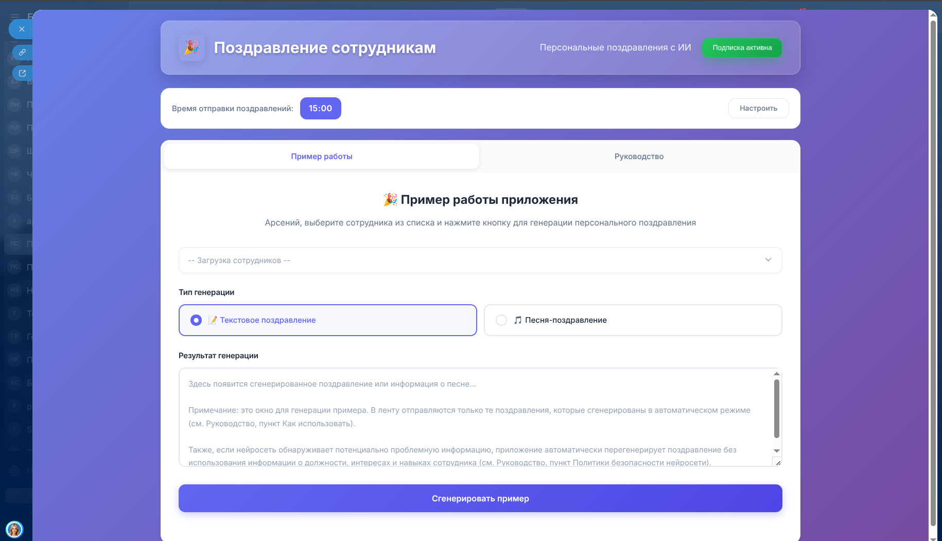 Приложение автоматически запускается в выбранное вами время, и генерирует поздравления сотрудникам в вашем Б24, у которых сегодня День Рождения, и публикует поздравление в ленте компании.