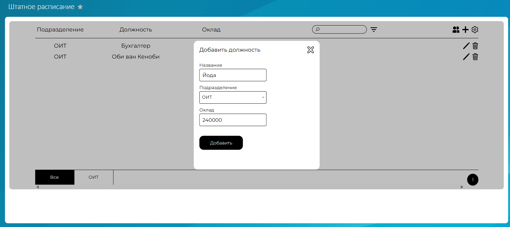 При добавлении необходимо указать название должности, выбрать подразделение и ввести оклад.