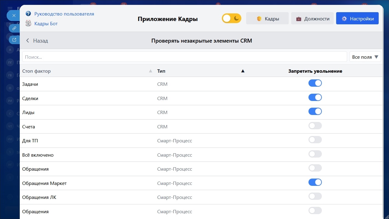 - Автоматическая проверка незакрытых элементов CRM перед увольнением
