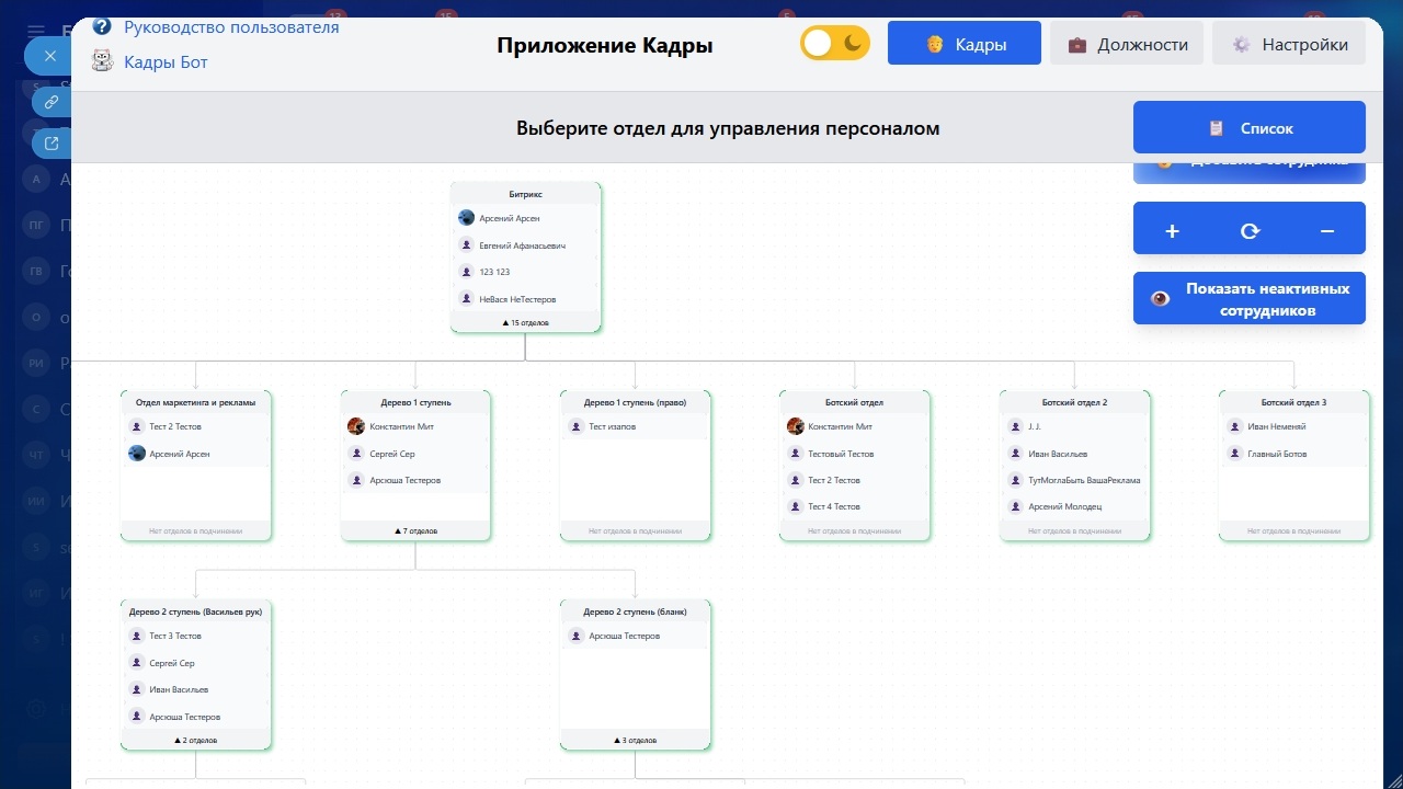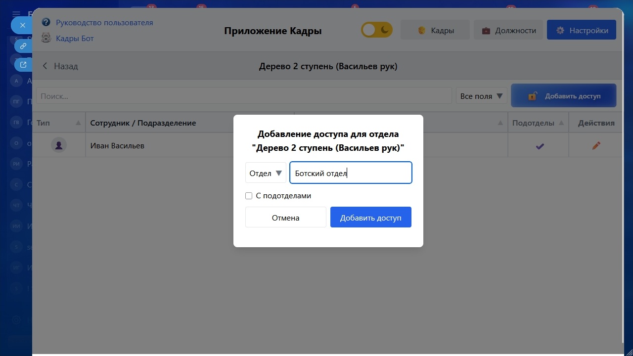 Приложение "Кадры" — решение для управления персоналом в Bitrix24. Обеспечивает централизованное управление сотрудниками, должностями и доступами через веб-интерфейс и чат-бот.