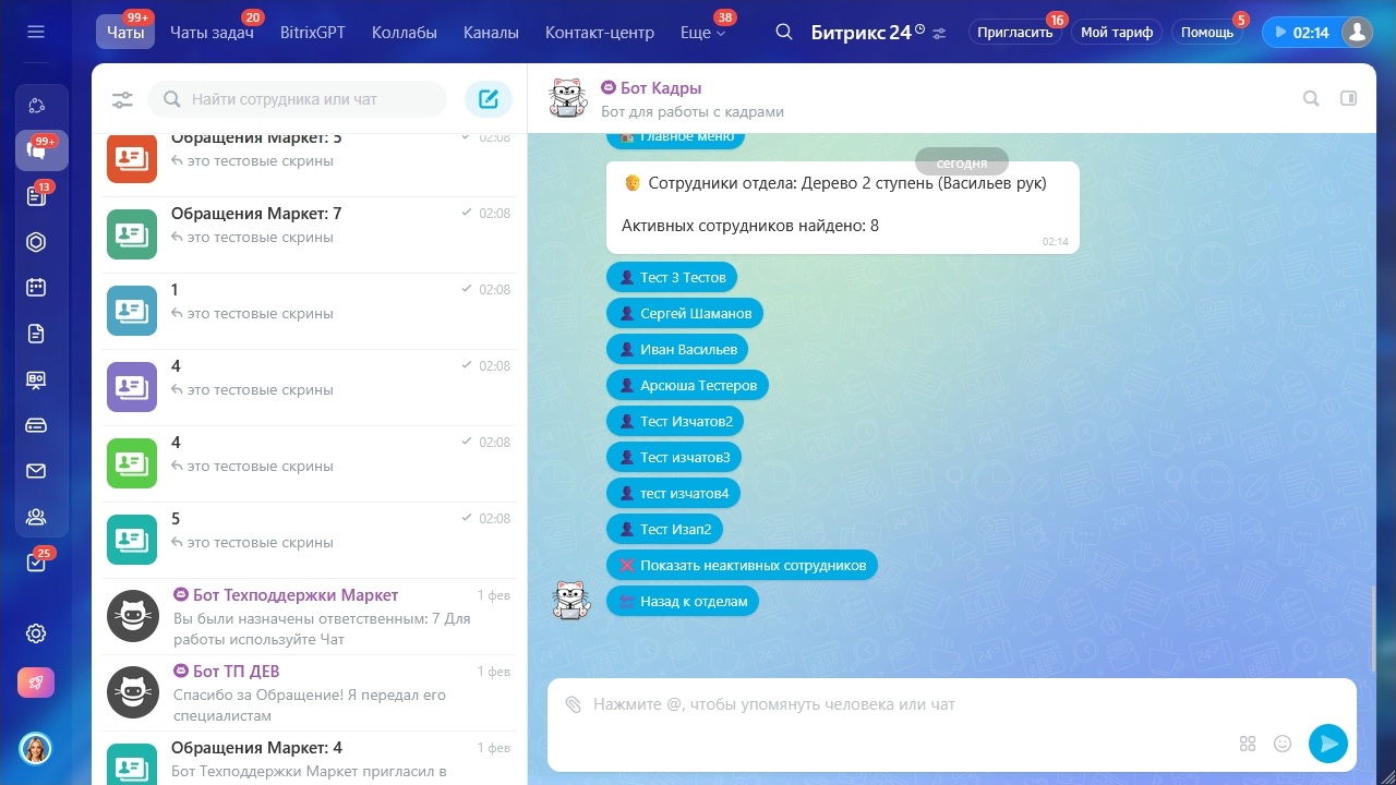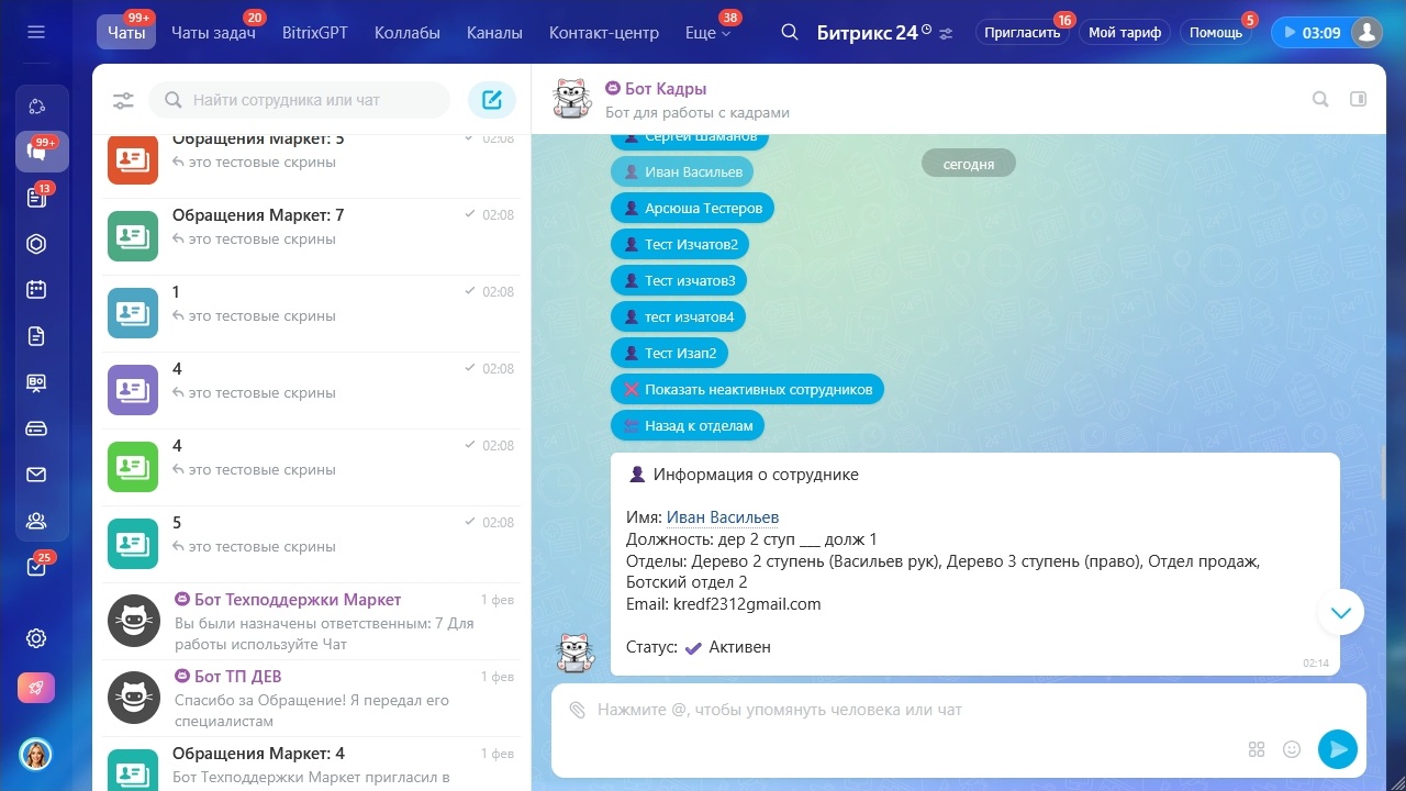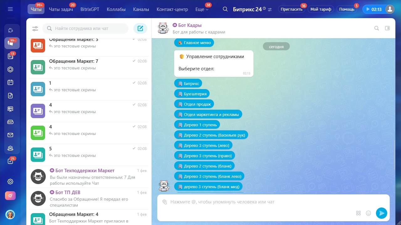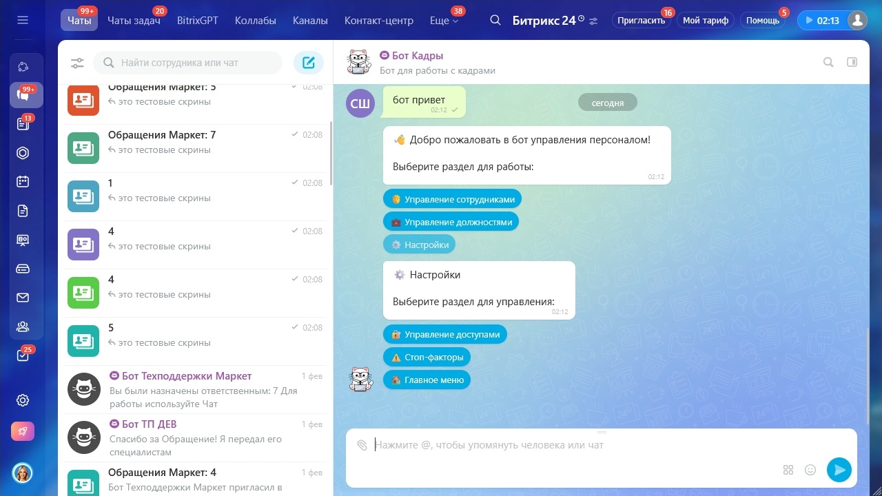 - Полный функционал управления кадрами через мессенджер Bitrix24