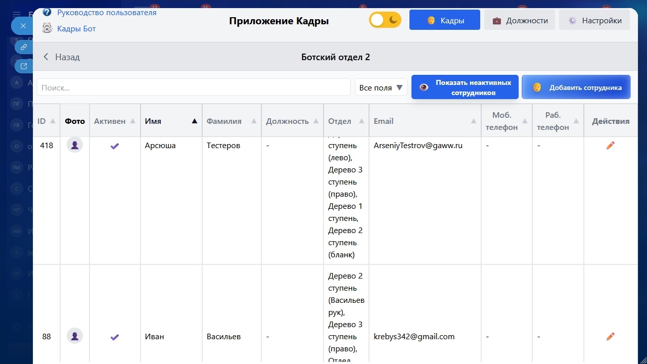 - Фильтрация по активным/неактивным сотрудникам