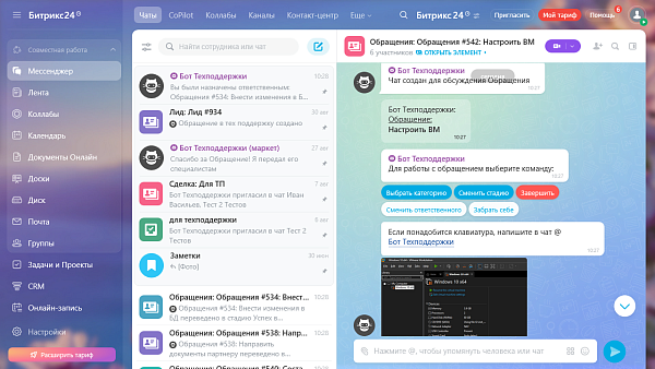 Интеграция Чат-бота: Вы всегда сможете обсудить ход выполнения задач, а так же управлять ими прямо из соответствующих чатов.