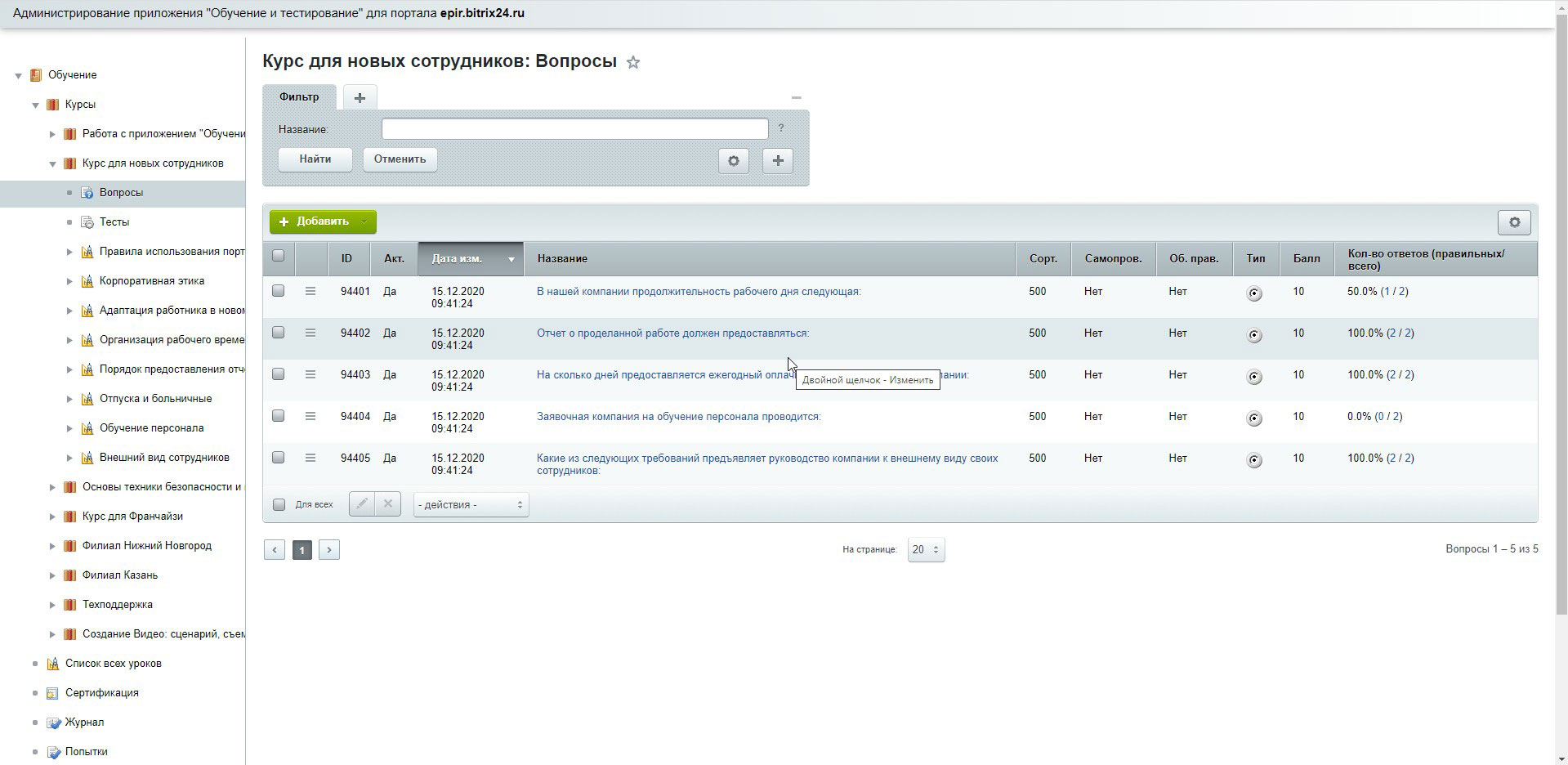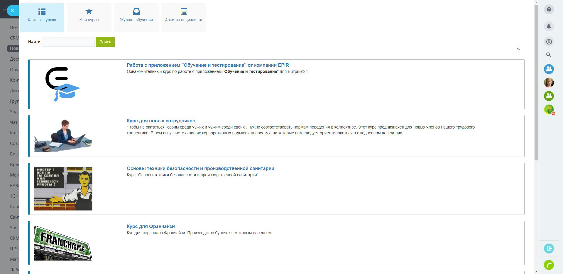 Приложение «Обучение и Тестирование» позволяет автоматизировать корпоративное обучение, создать базу знаний компании, контролировать уровень квалификации персонала во всех структурных подразделениях компании. Приложение позволяет быстро создать обучающие курсы из имеющихся у Вас материалов. Вы можете проводить обучение и тестирование как внутренних сотрудников компании, получающих доступ к курсам через Битрикс24, так и для неограниченного количества внешних пользователей, получающих доступ к вашим курсам по вашему приглашению.