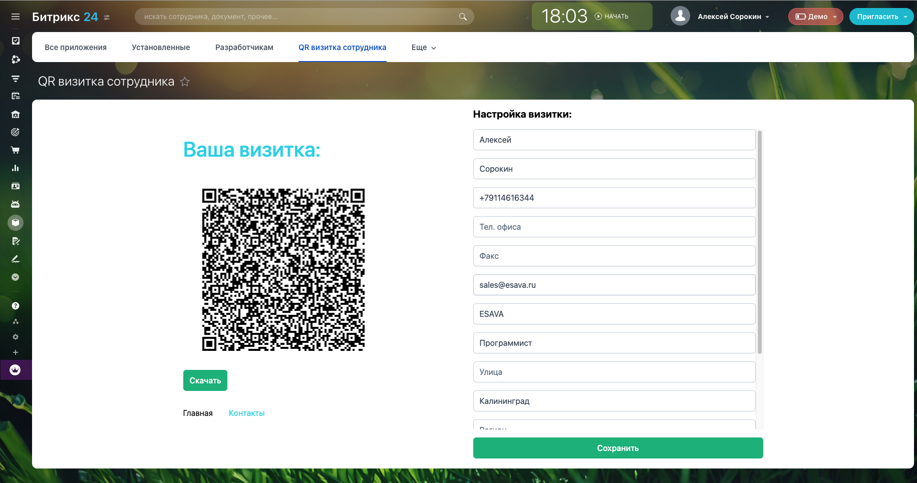 Приложение позволяет сгенерировать QR код с вашим контактом для любых мобильных устройств. После сканирования клиент получит предложение сохранить Ваш контакт в своей телефонной книге.