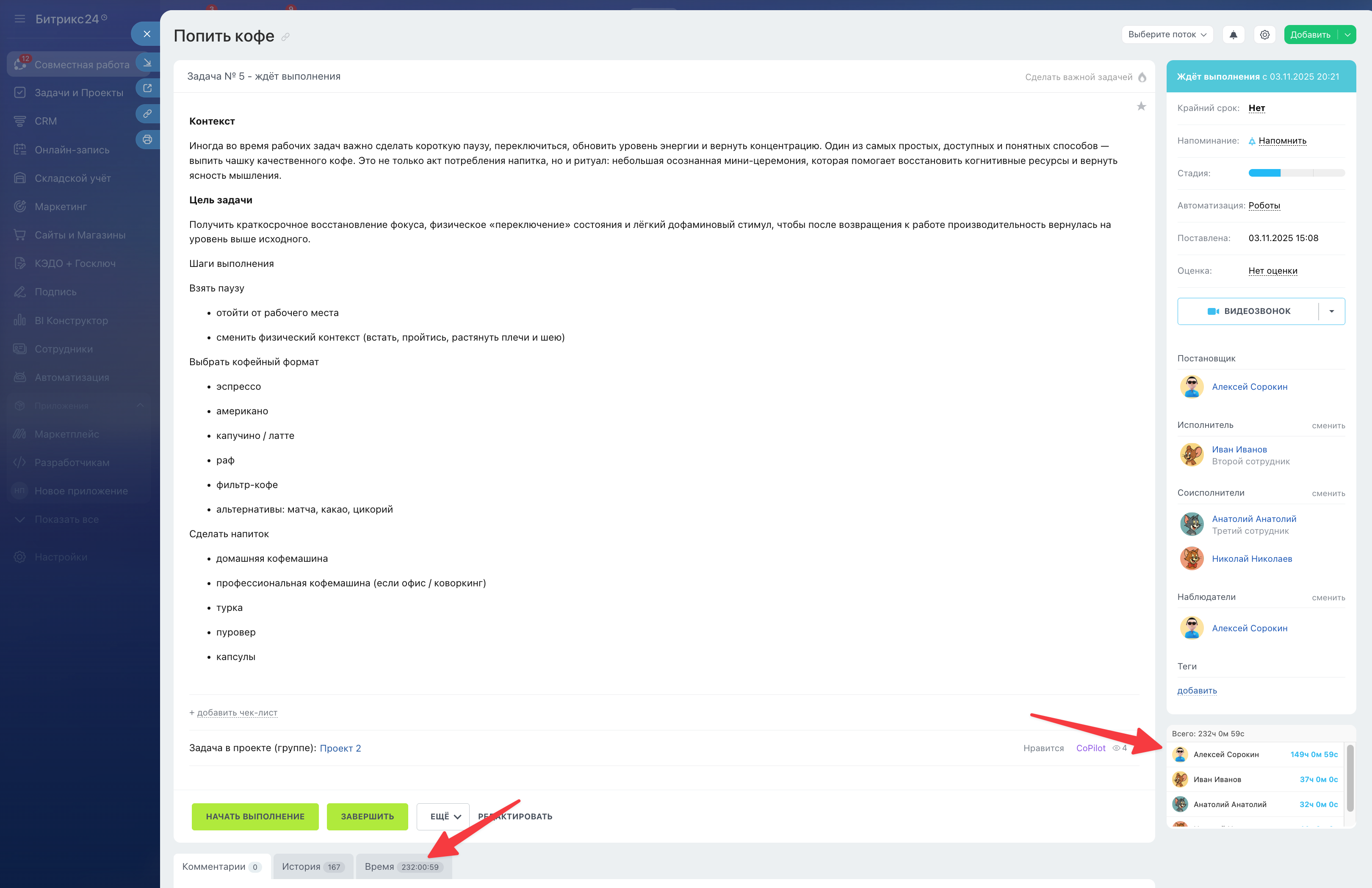 Приложение помогает руководителям проектов и менеджерам оперативно оценивать распределение рабочего времени по задаче, выявлять самых вовлечённых участников и контролировать трудозатраты команды.