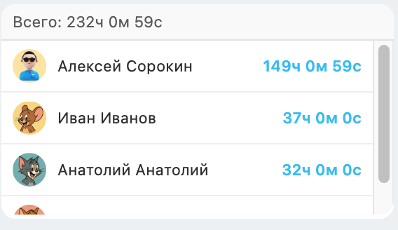 - Сортировка участников по объёму затраченного времени (от большего к меньшему)