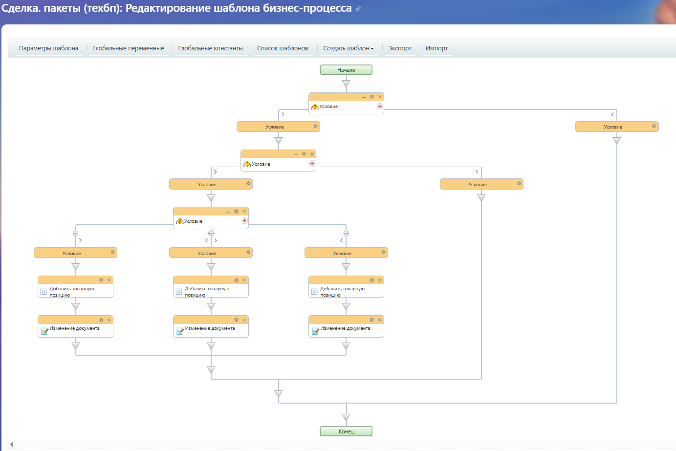 Бизнес-процесс проверяет, заполнено ли поле "пакет" в сделке, и в зависимости от результата автоматически добавляет соответствующий товар в сделку.