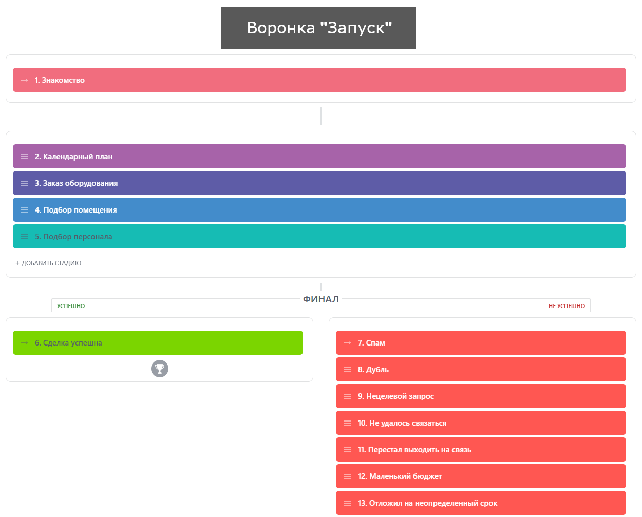 Воронка "Запуск" предназначена для поэтапного открытия франчайзинговой точки клиента и состоит из специализированных стадий: