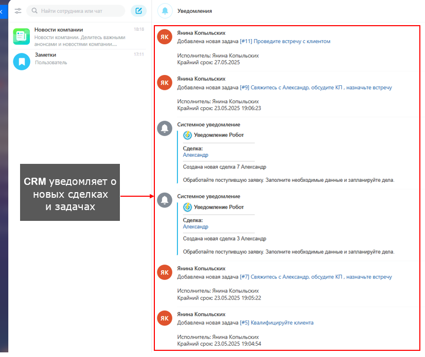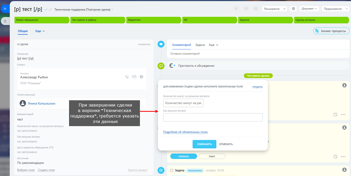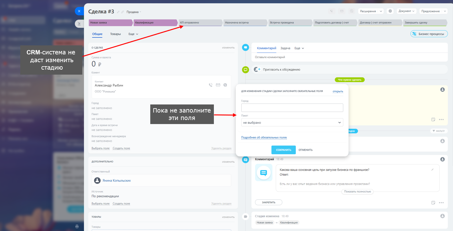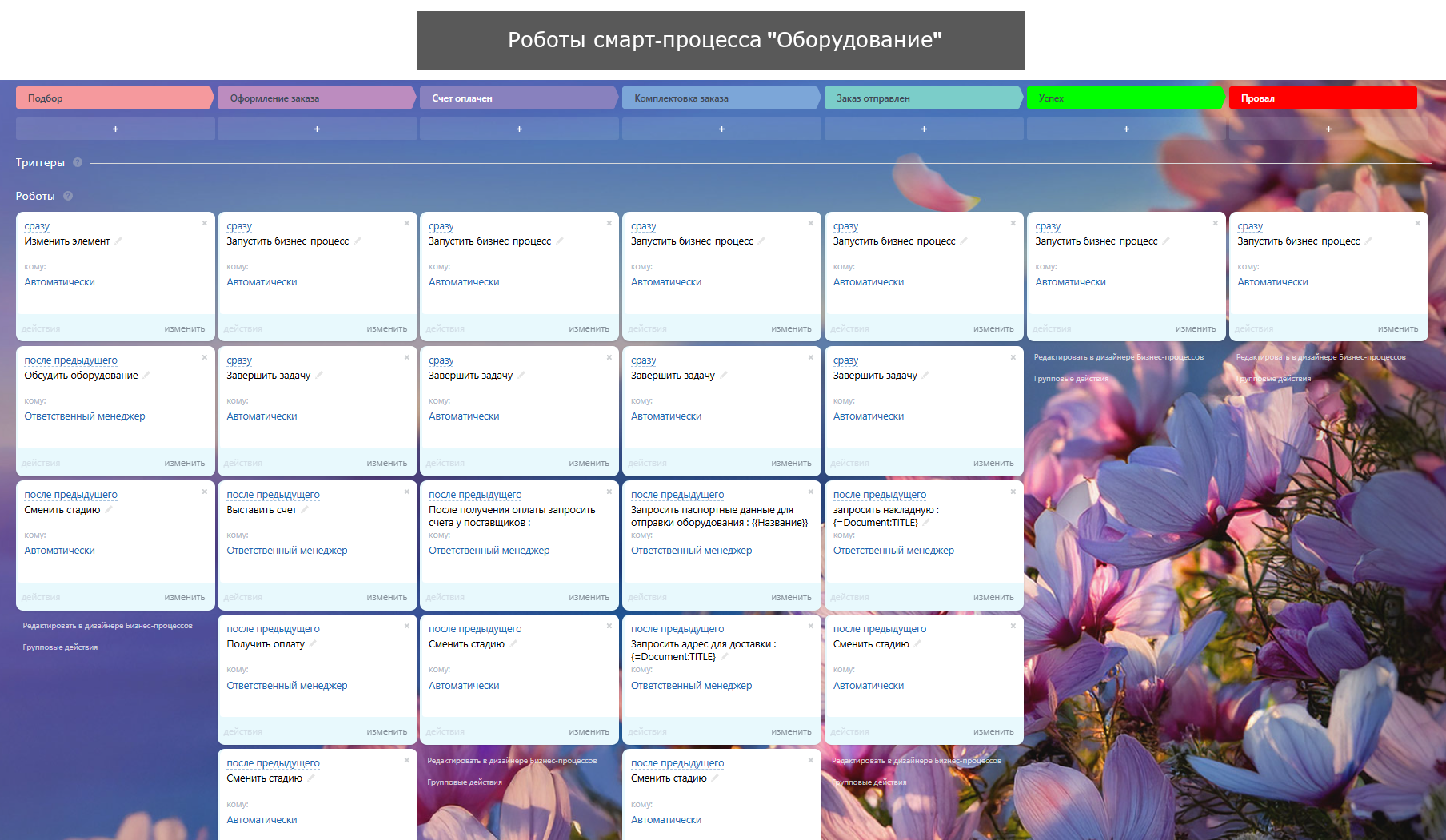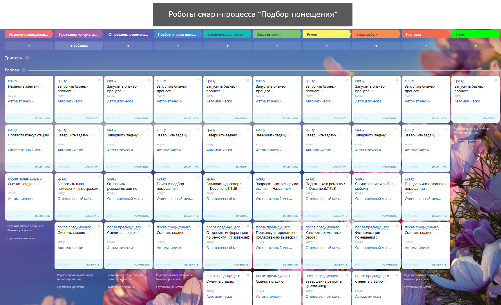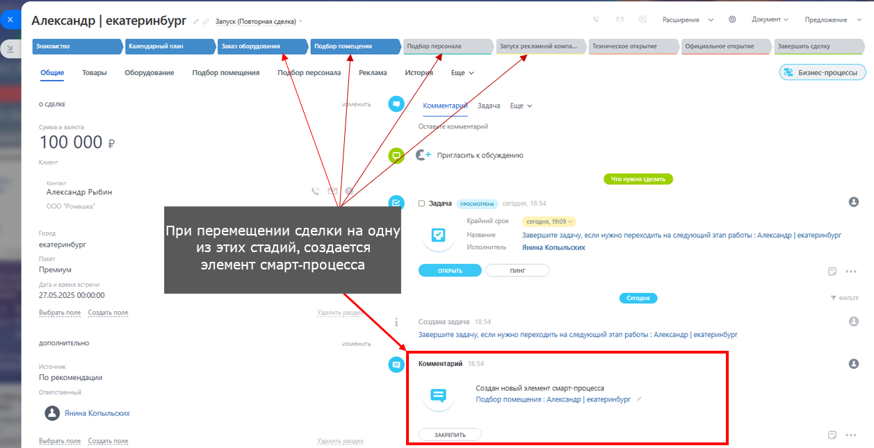 Каждый из этих этапов связан с запуском соответствующего смарт-процесса. Роботы автоматически создают элементы смарт-процессов, ставят задачи, контролируют сроки и добавляют комментарии в сделку.