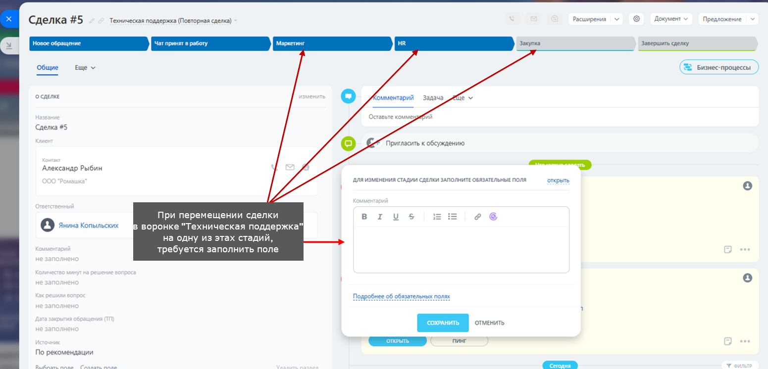 При перемещении смарт-процесса на другую стадию в связанную сделку автоматически добавляется комментарий с информацией о том, какой смарт-процесс и на какую стадию перешёл. Это обеспечивает прозрачность коммуникаций и позволяет быстро отслеживать ход работ.