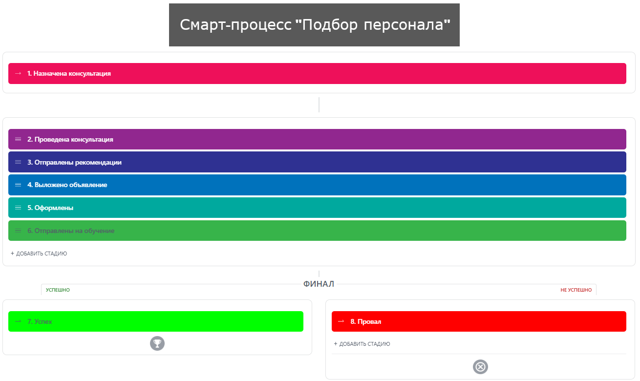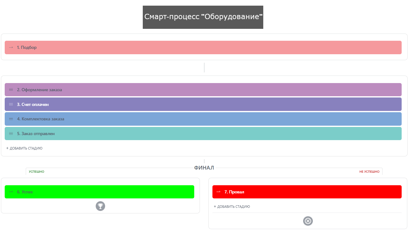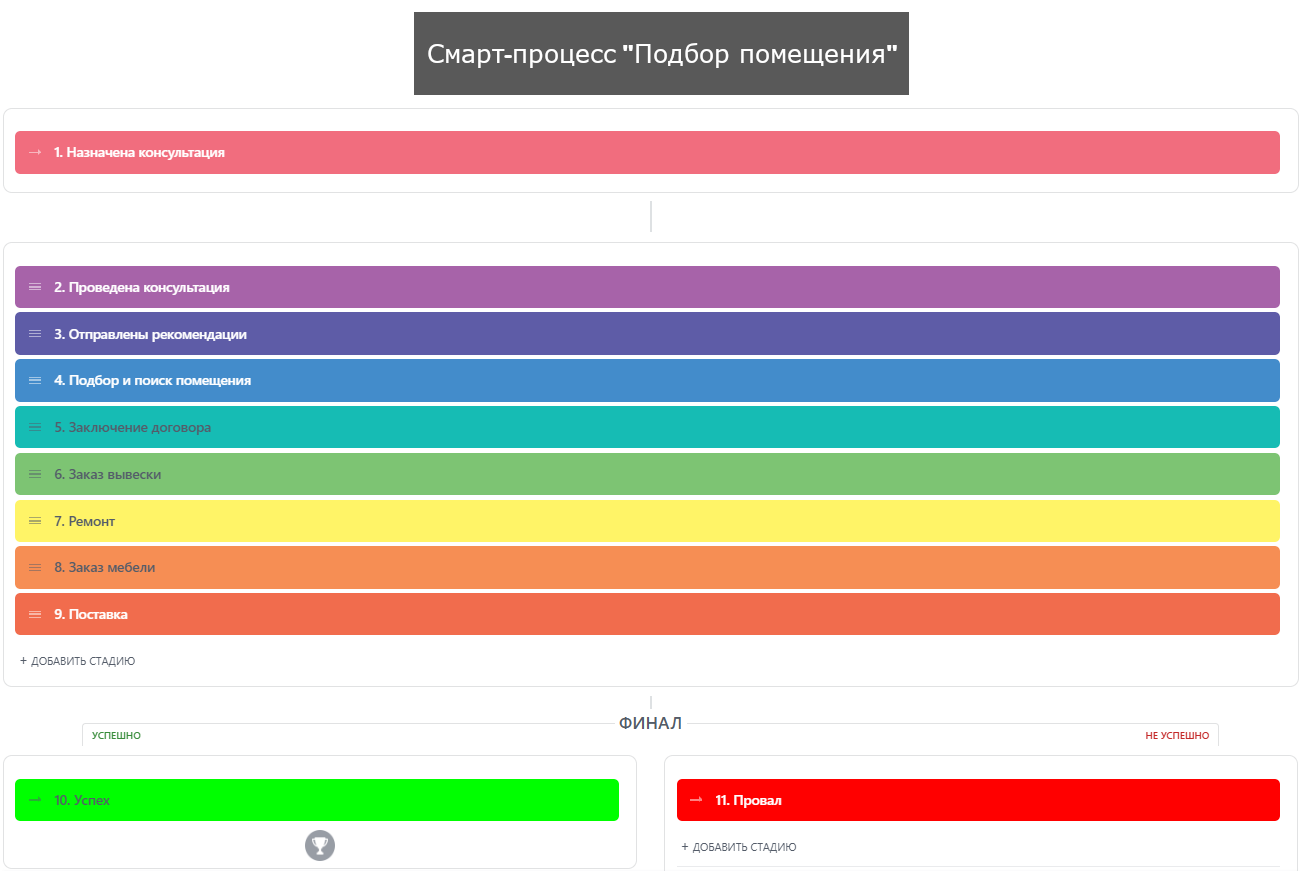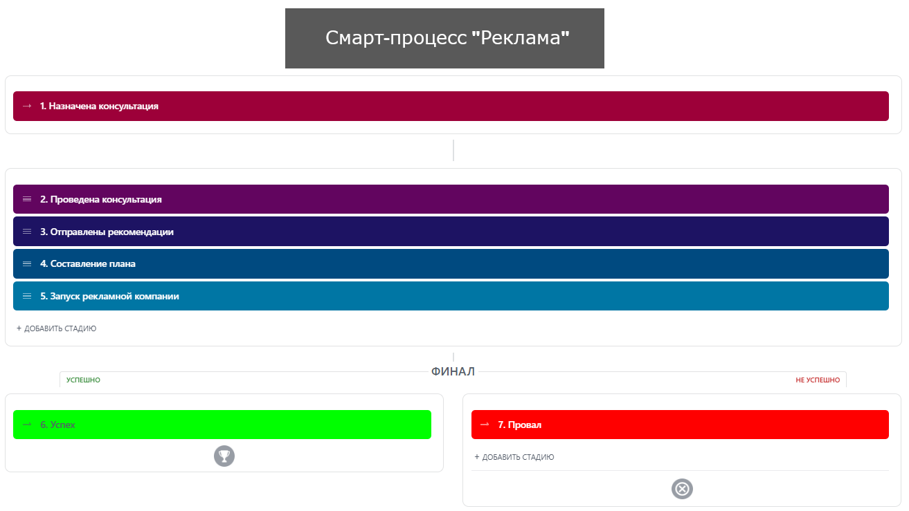 Бизнес-процессы — это последовательности автоматизированных или полуавтоматизированных действий, которые запускаются при наступлении определённых событий (например, изменение стадии сделки или смарт-процесса). Они позволяют стандартизировать и автоматизировать рутинные операции, минимизировать человеческий фактор и обеспечить контроль исполнения задач.