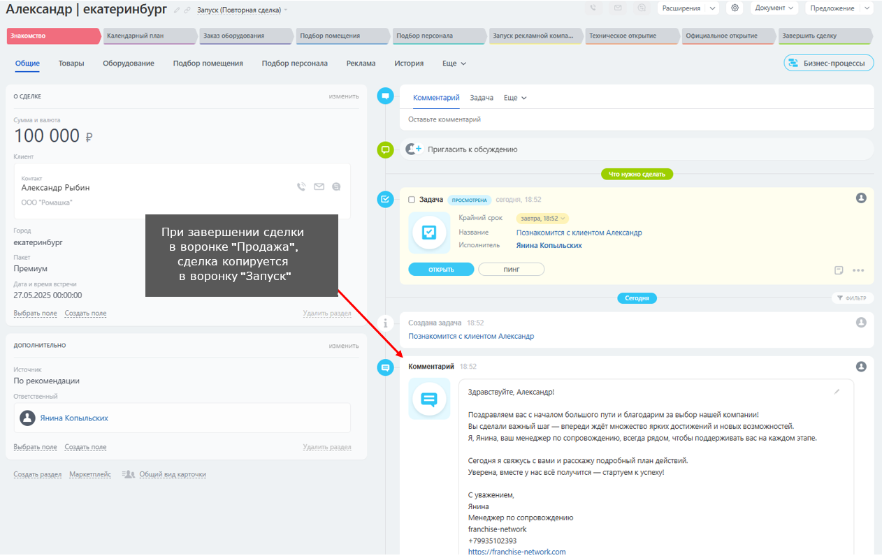 Когда сделка в воронке "запуск" завершается успешно, на протяжении первых четырёх месяцев каждую неделю автоматически ставится задача ответственному менеджеру связаться с клиентом. Это позволяет выстроить качественное постпродажное сопровождение и повысить лояльность франчайзи.