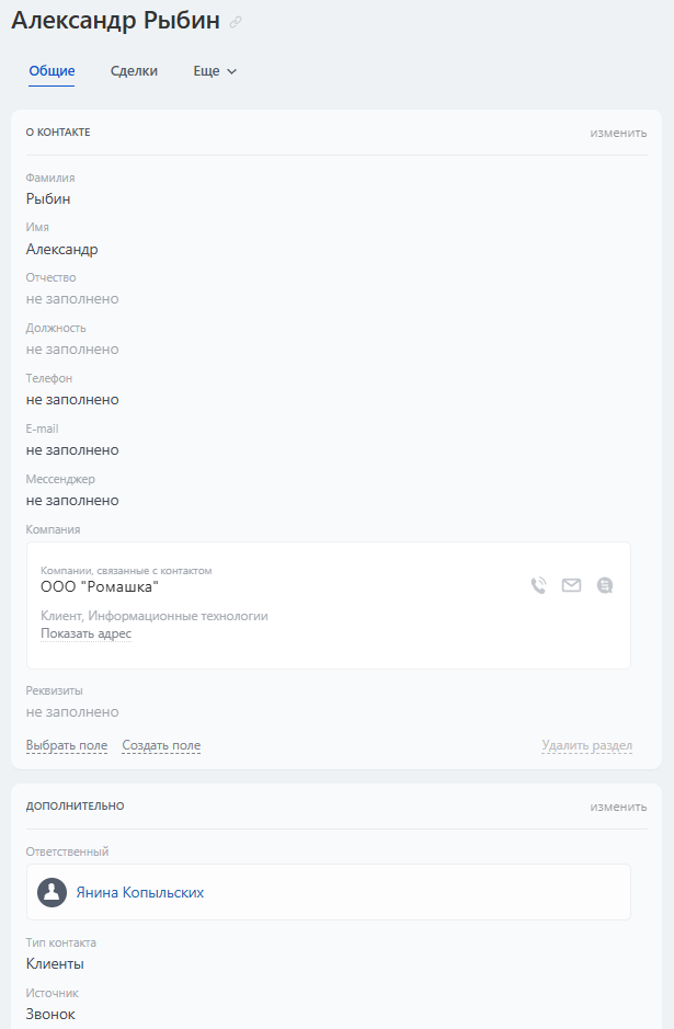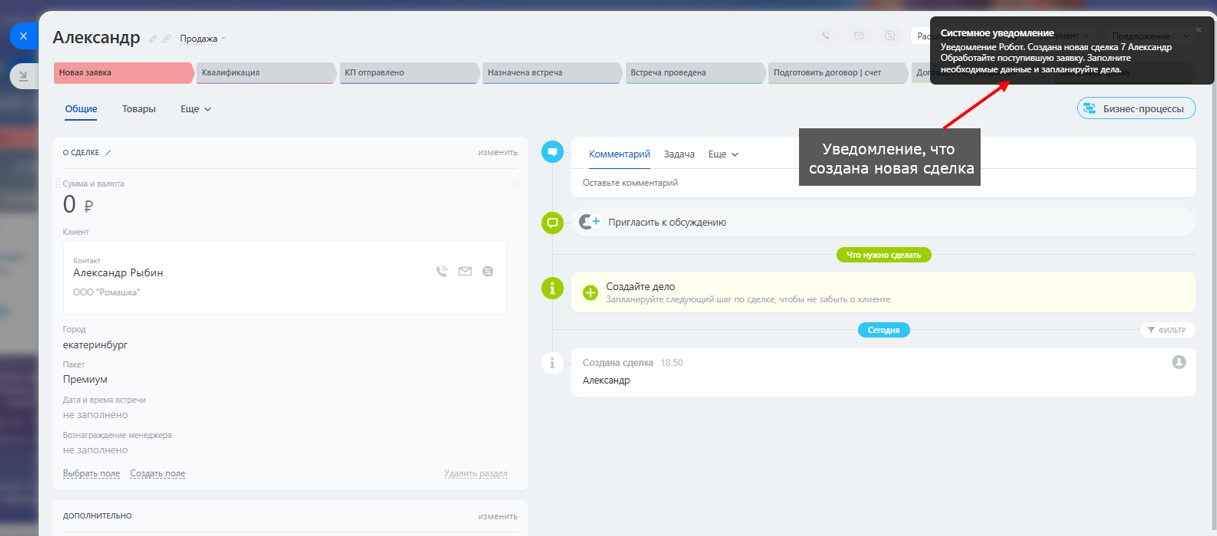 Фиксация нового запроса от клиента. Роботы автоматически изменяют статусы, ставят задачи и уведомляют ответственных.