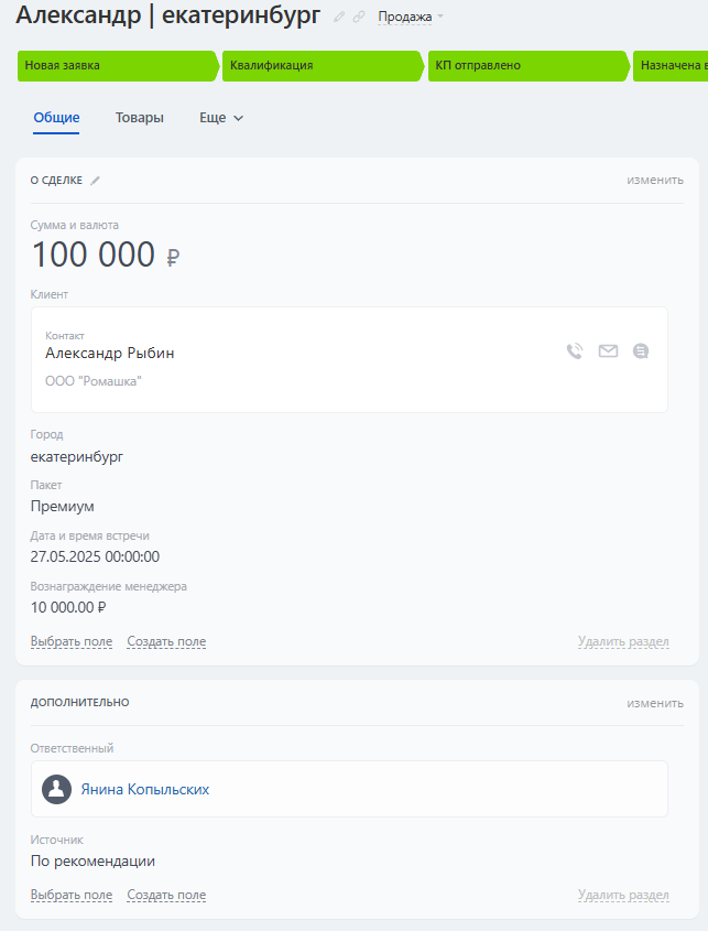 Здесь происходит первичная обработка запроса: менеджер уточняет детали, выявляет потребности клиента, определяет бюджет и сроки. Роботы помогают собирать информацию и назначать встречи, а также добавляют комментарии в сделку для прозрачности коммуникаций.