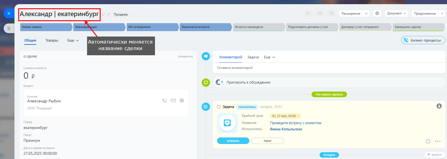 После отправки документов система автоматически завершает соответствующие задачи и фиксирует изменения в сделке.