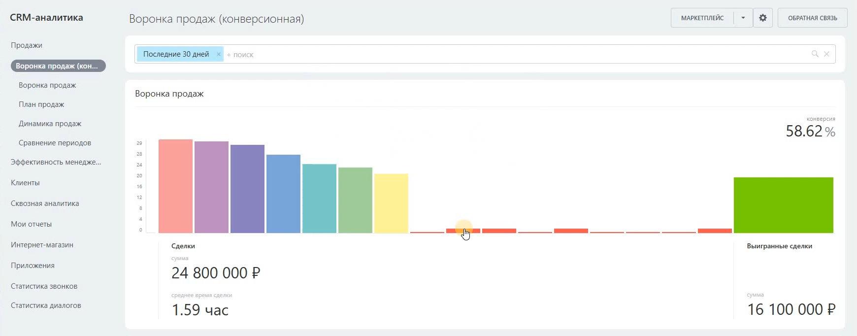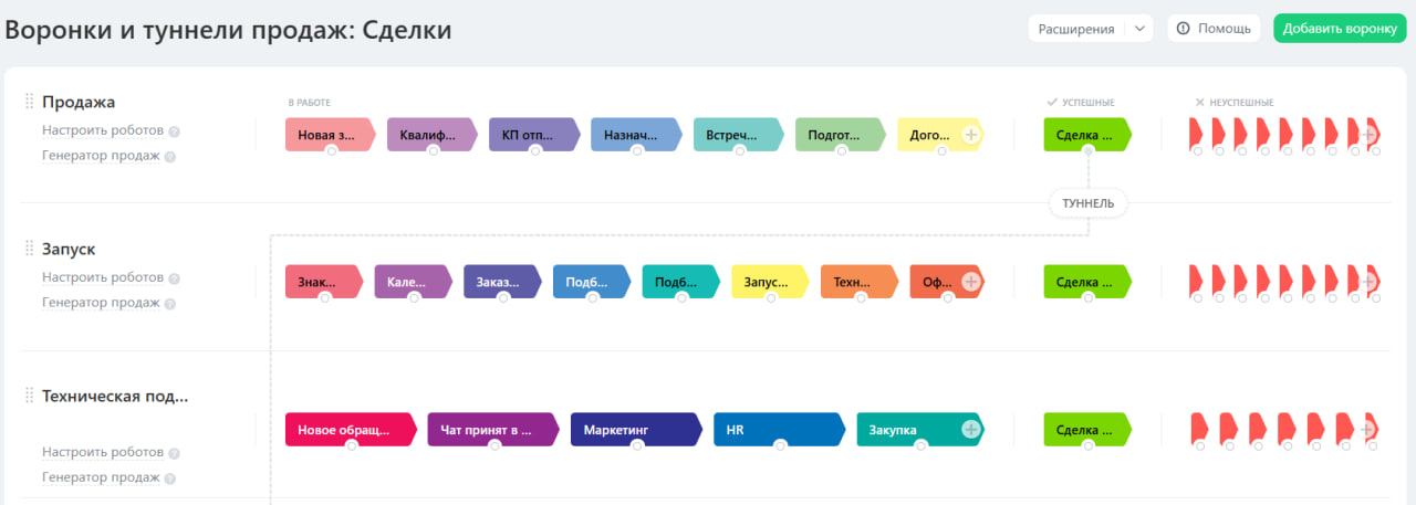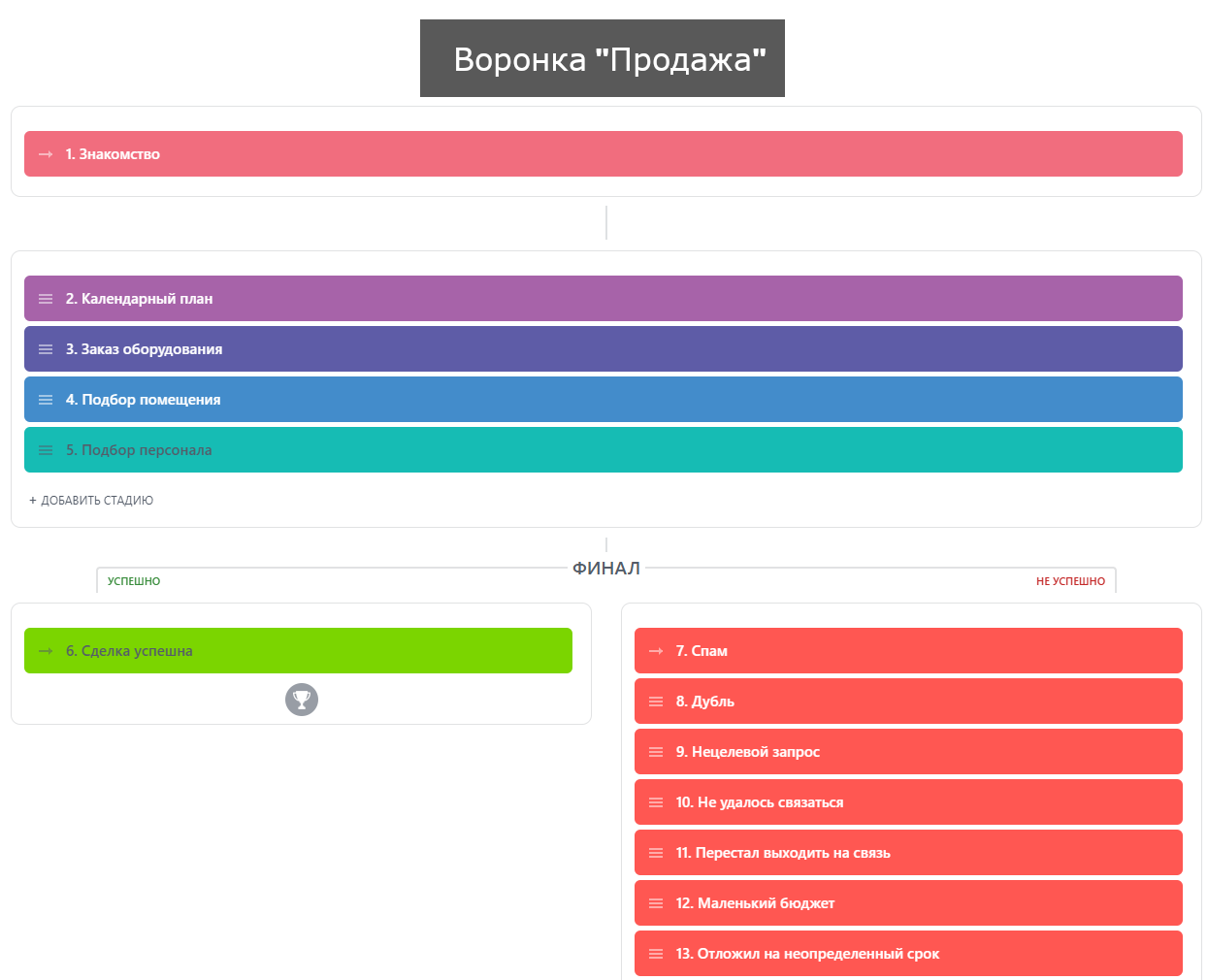 Воронка продаж построена по классической логике работы с клиентом и включает следующие основные этапы:
