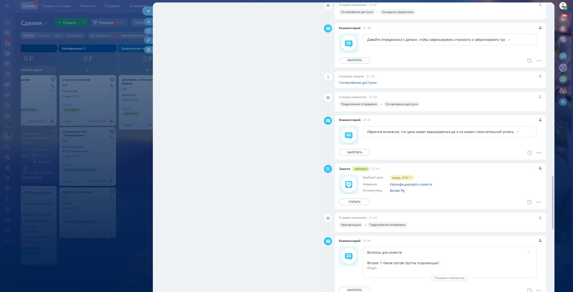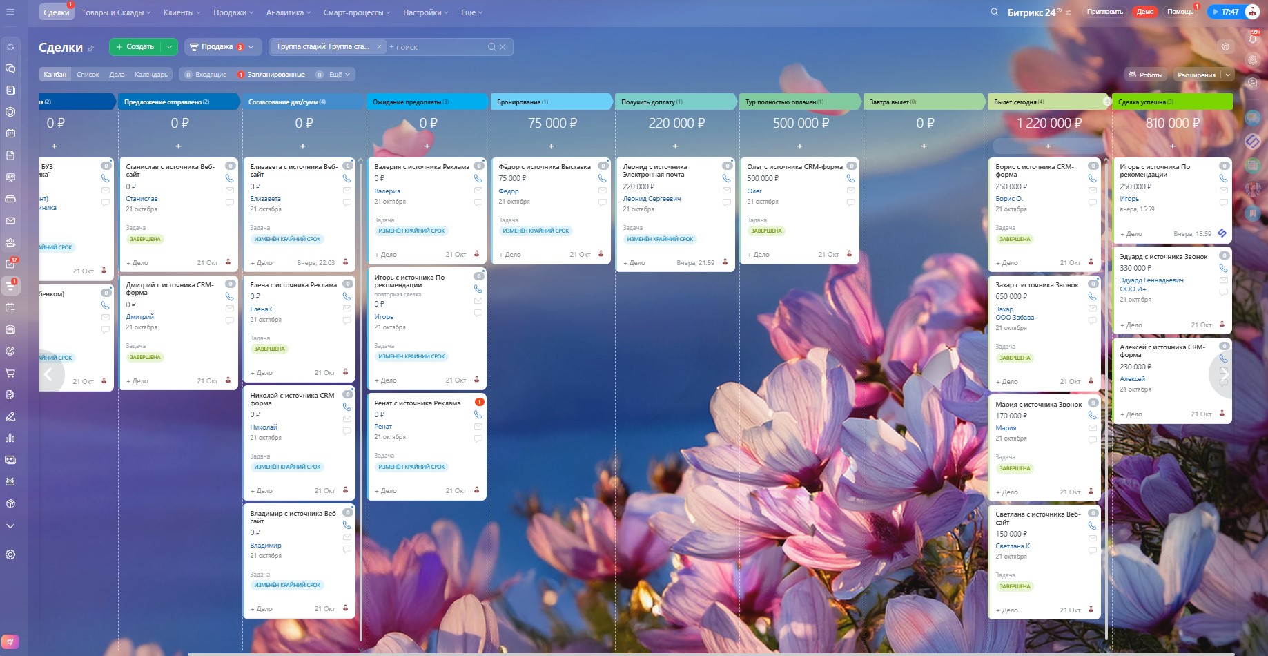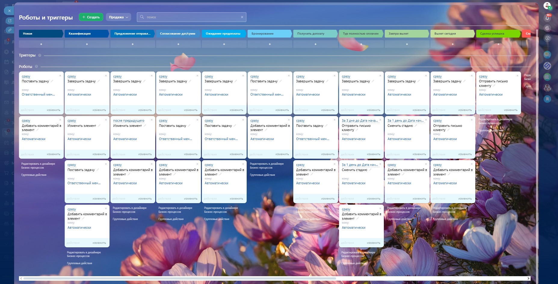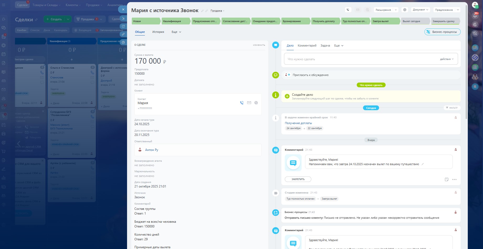 Новая сделка → Квалификация → Предложение отправлено → Согласование дат/сумм → Ожидание предоплаты → Бронирование → Получить доплату → Тур полностью оплачен → Завтра вылет → Вылет сегодня → Успех