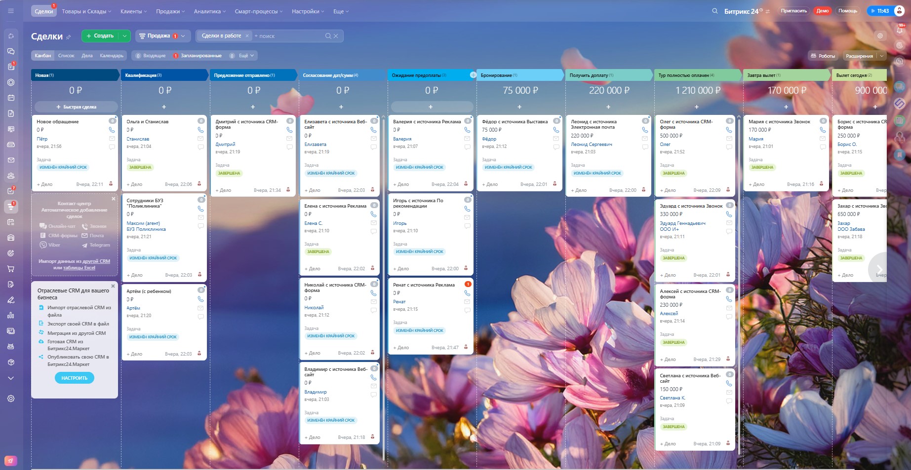 CRM для услуг Турагентства обеспечивает полный контроль над процессами: от привлечения клиента до успешного завершения сделки. Система повышает эффективность отделов продаж на 50%, ускоряет обработку сделок и улучшает клиентский опыт.
