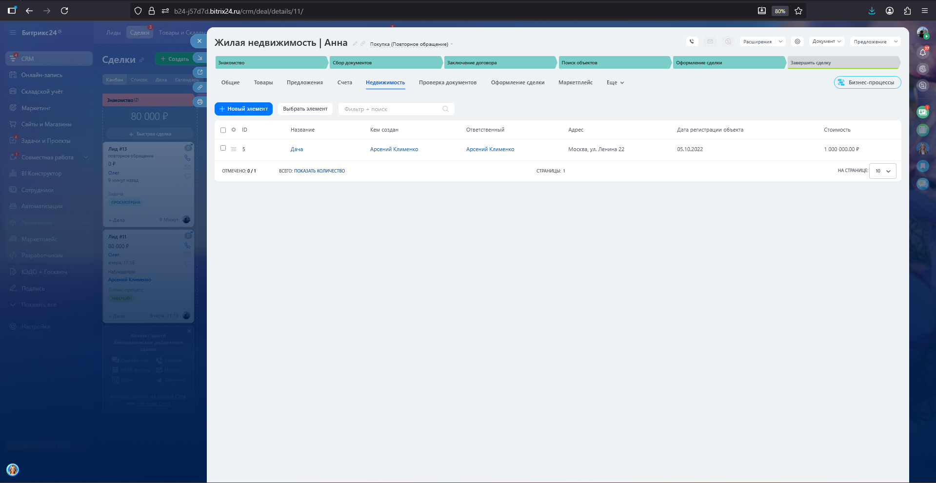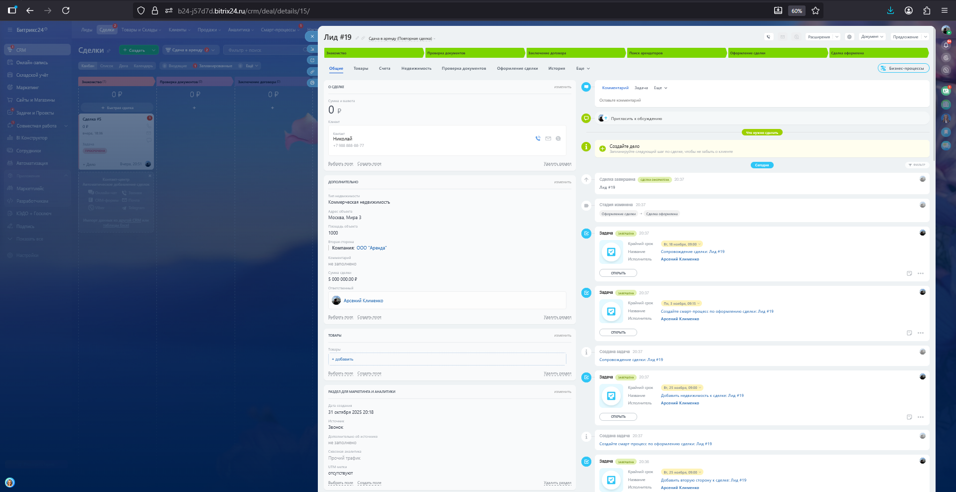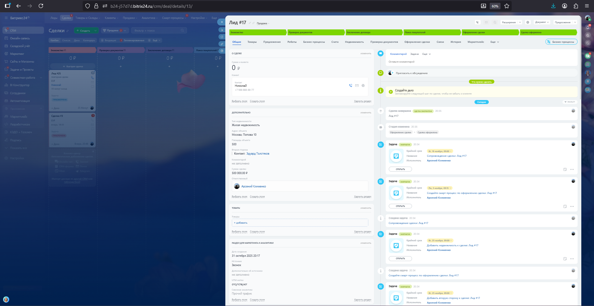 Автоматизация работы агентства недвижимости — от первичной заявки клиента до заключения сделки с второй стороной. Система управляет стадиями сделки, контролирует задачи менеджеров.