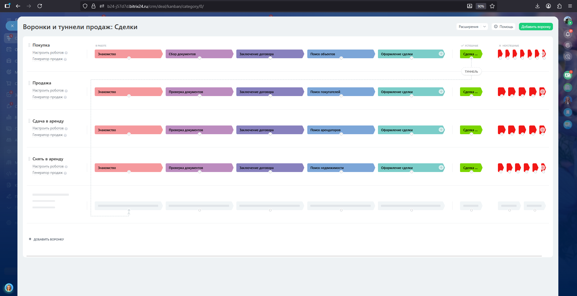 Знакомство → Проверка документов → Заключение договора → Поиск арендаторов → Оформление сделки → Сделка оформлена\Перестал выходить на связь\Передумал сдавать\Отложил сдачу\Ушел к другим\Сдал самостоятельно
