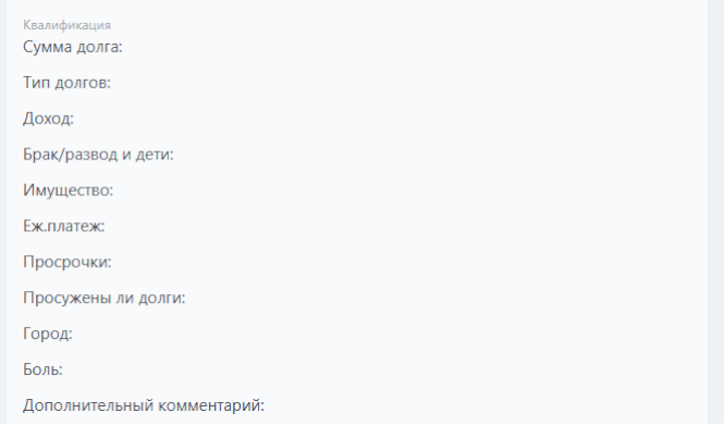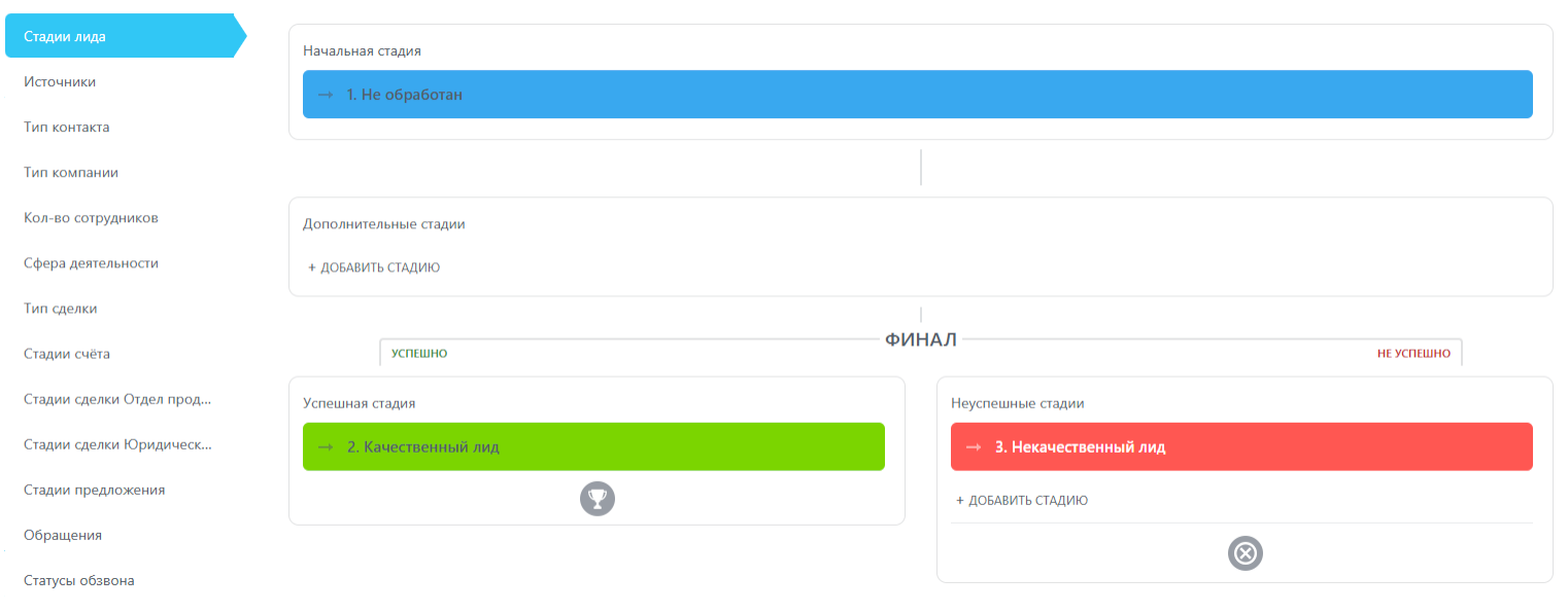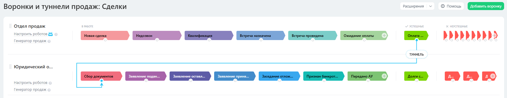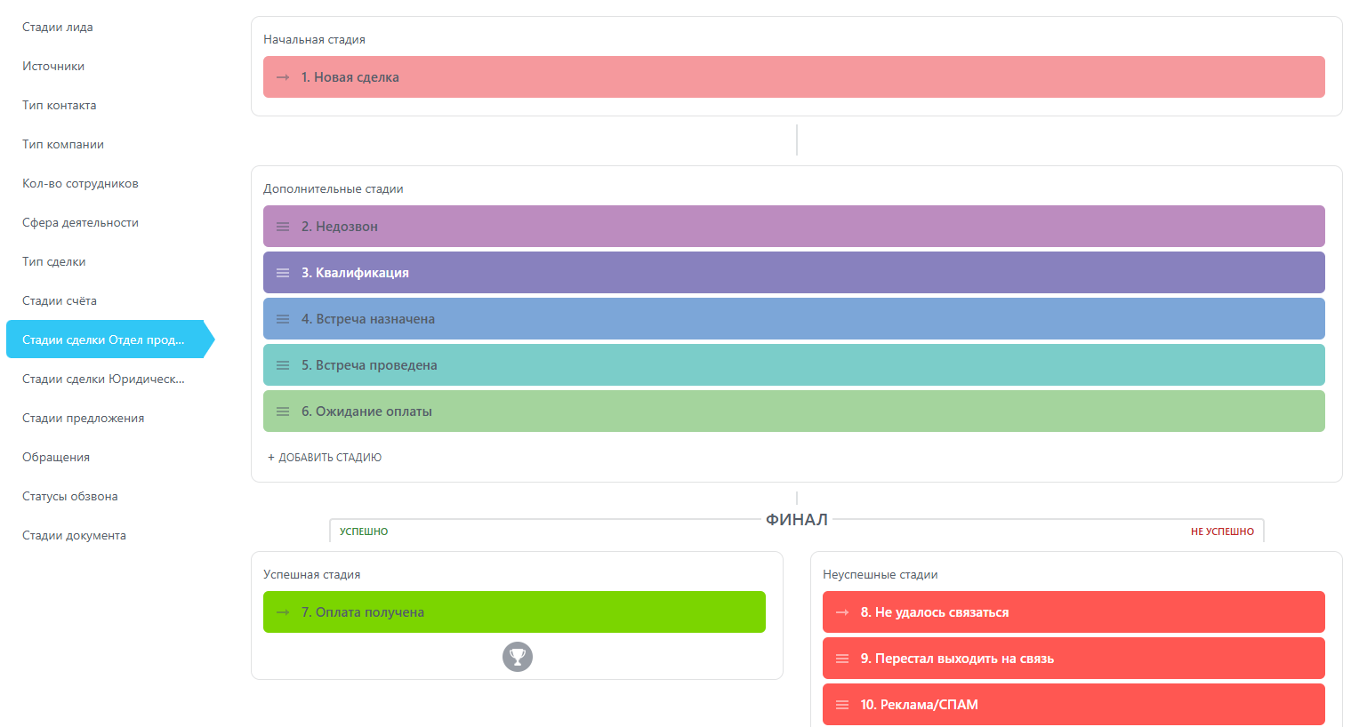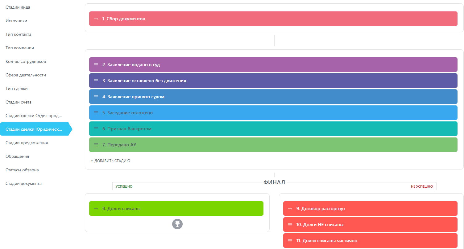 Новая сделка → Недозвон → Квалификация → Встреча назначена → Встреча проведена → Ожидание оплаты → Оплата получена / Неуспешные стадии: Не удалось связаться, Перестал выходить на связь, Реклама/СПАМ, Много имущества, Не подходит под списание, Выбрал другую компанию, Выбрал свой вариант, Негатив, Не оставлял заявку, Дубль заявки