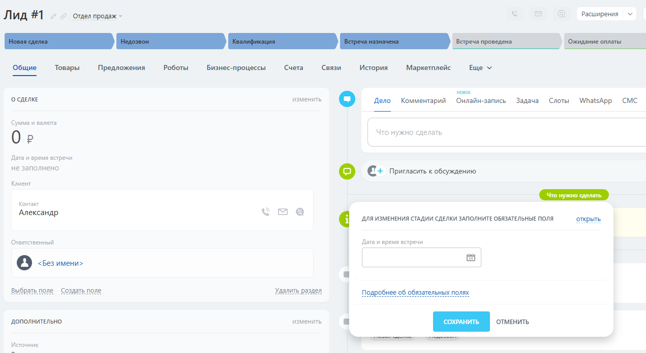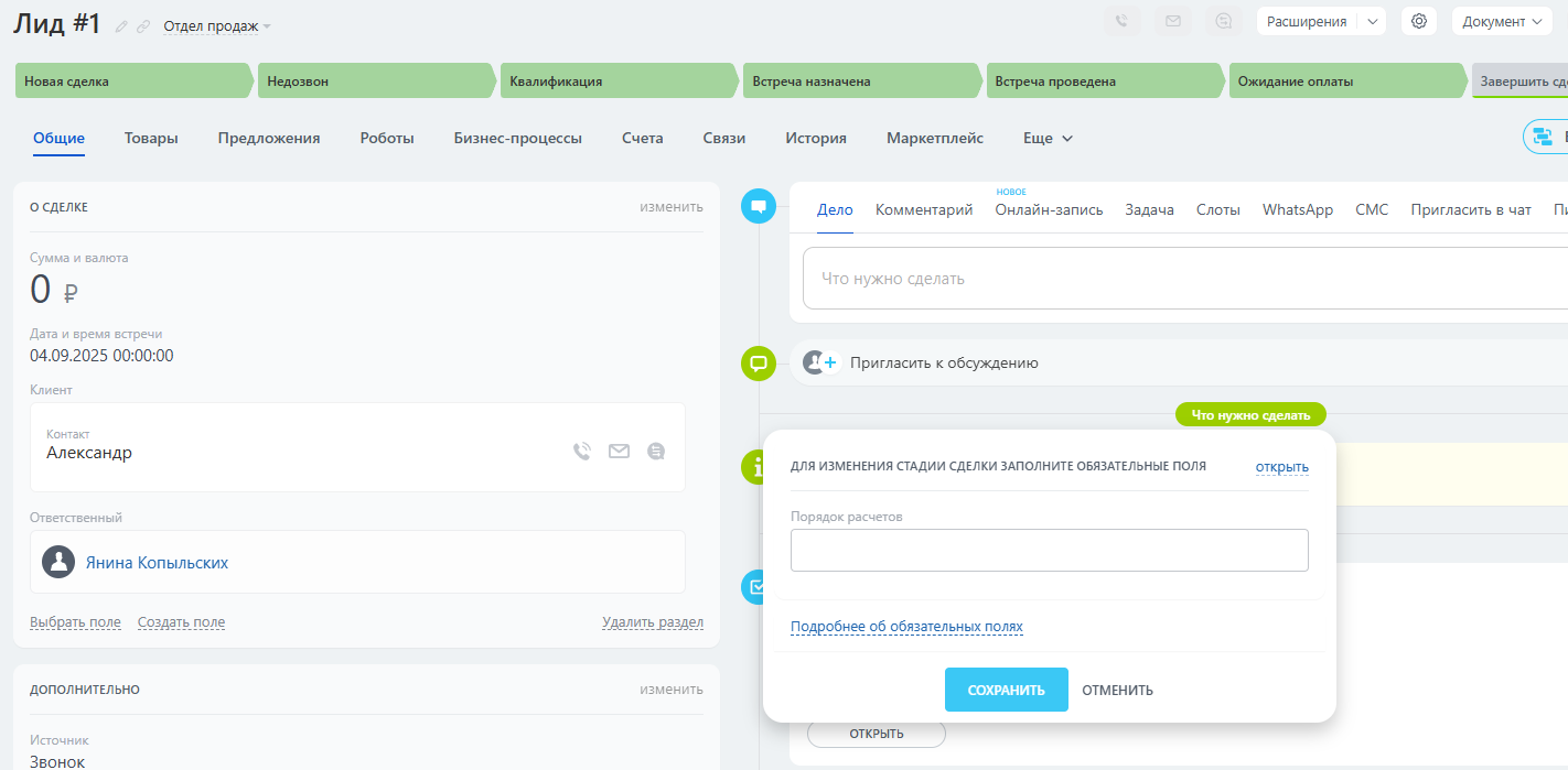 Единый цикл от лида до списания долгов с автоматическим переносом сделок между отделами.