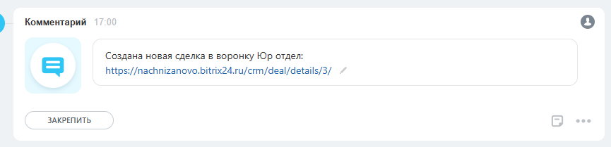 При успешном закрытии сделки добавляется комментарий со ссылкой на новую сделку в юридическом отделе (в роботе необходимо заменить домен на актуальный).